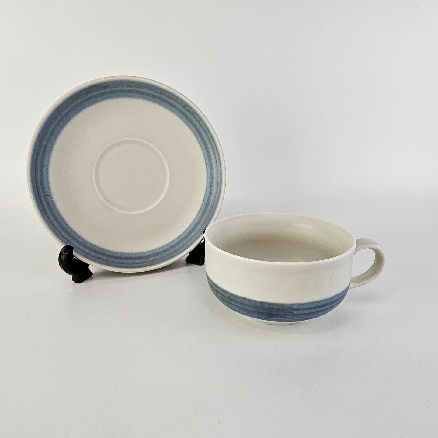 Kop og underkop i stentøj fra stellet Edith Sonne, mat hvid dekoreret med en blå stribe