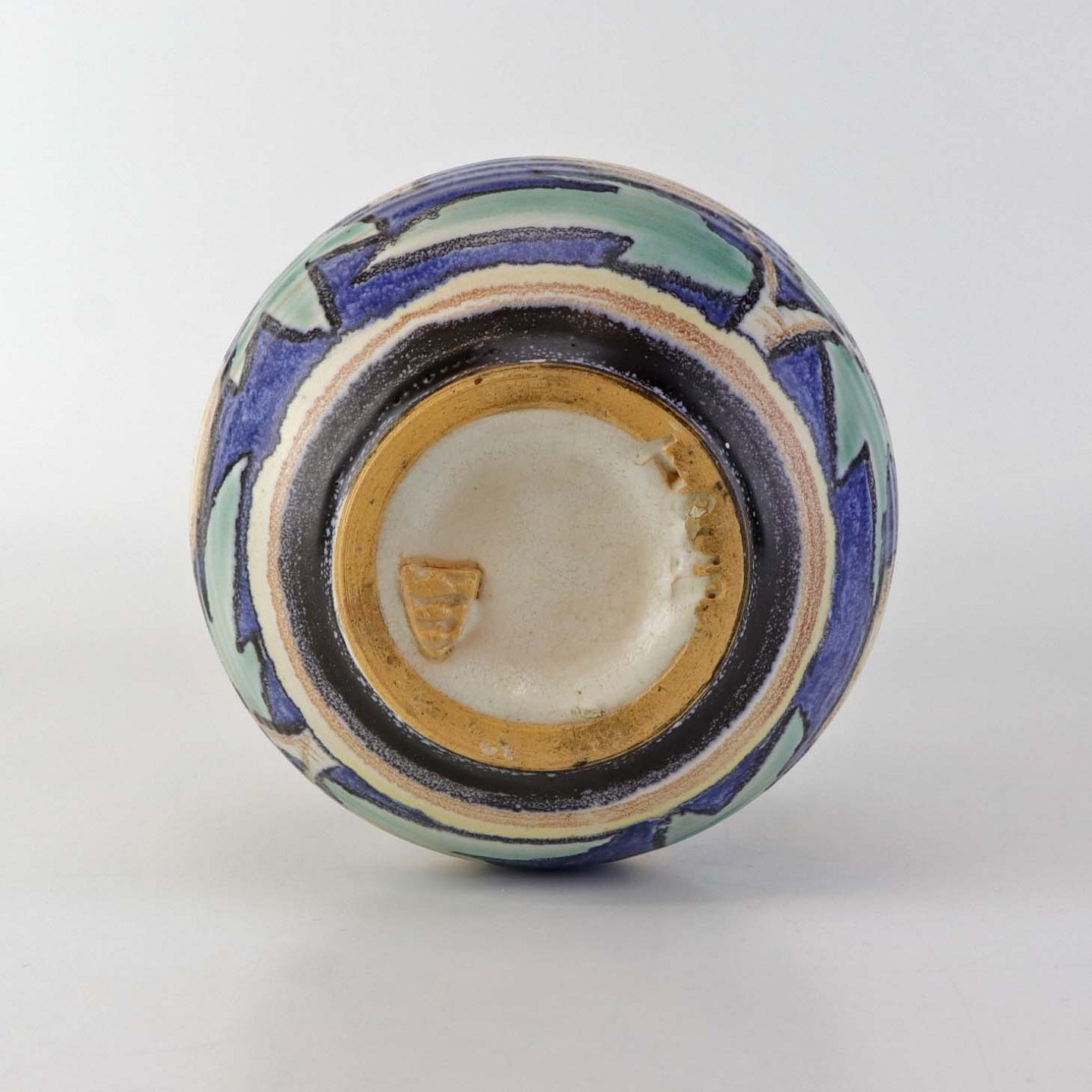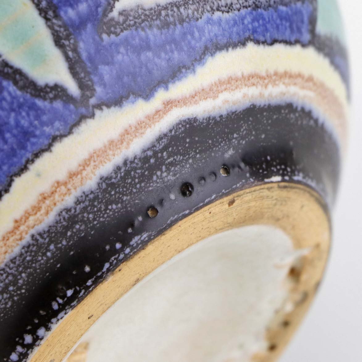 Oval vase i keramik med let riflet struktur og dekoreret med farverig blomstermotiv på blå baggrund.