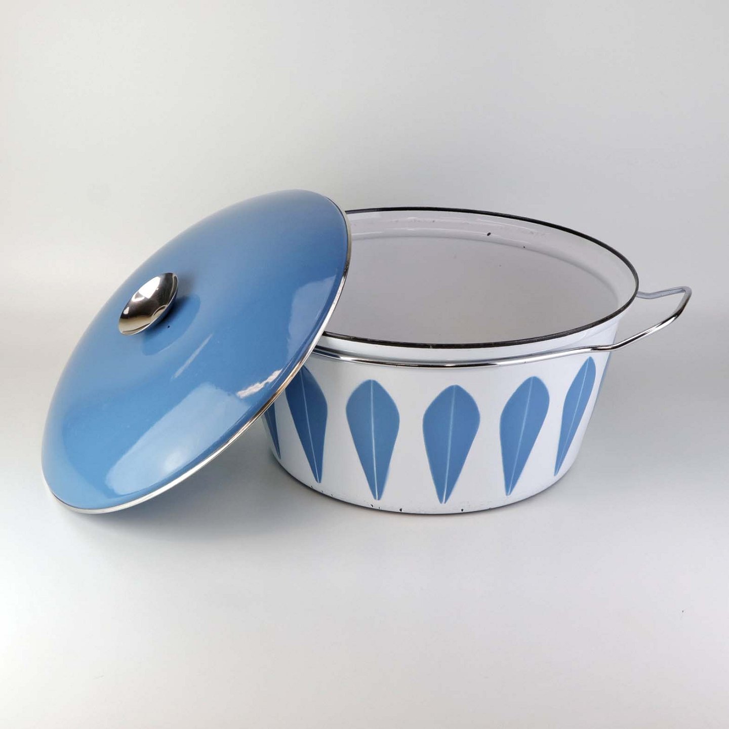 Stor emalje gryde med låg og med blå Lotus motiv. Gryden er fra 1960'erne.