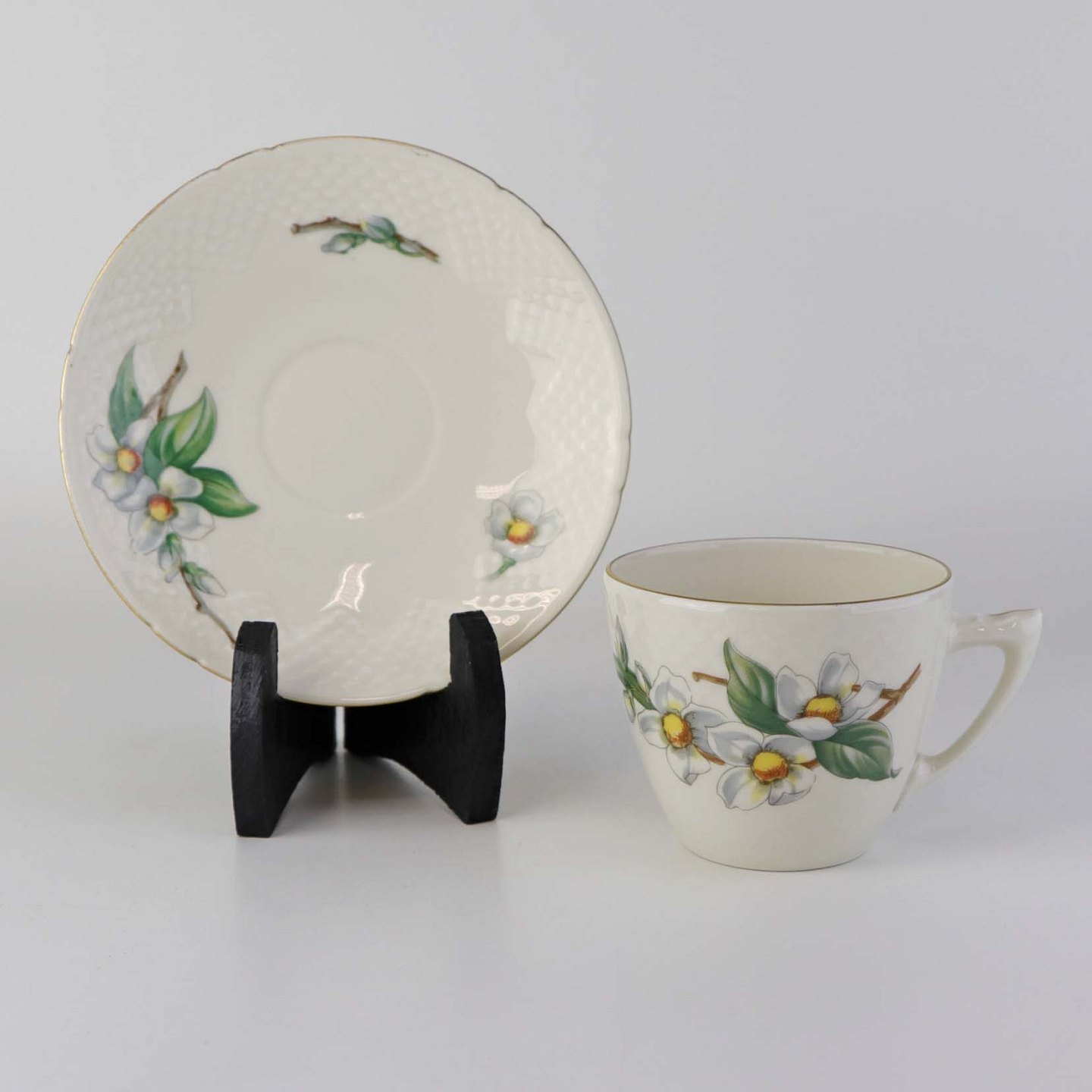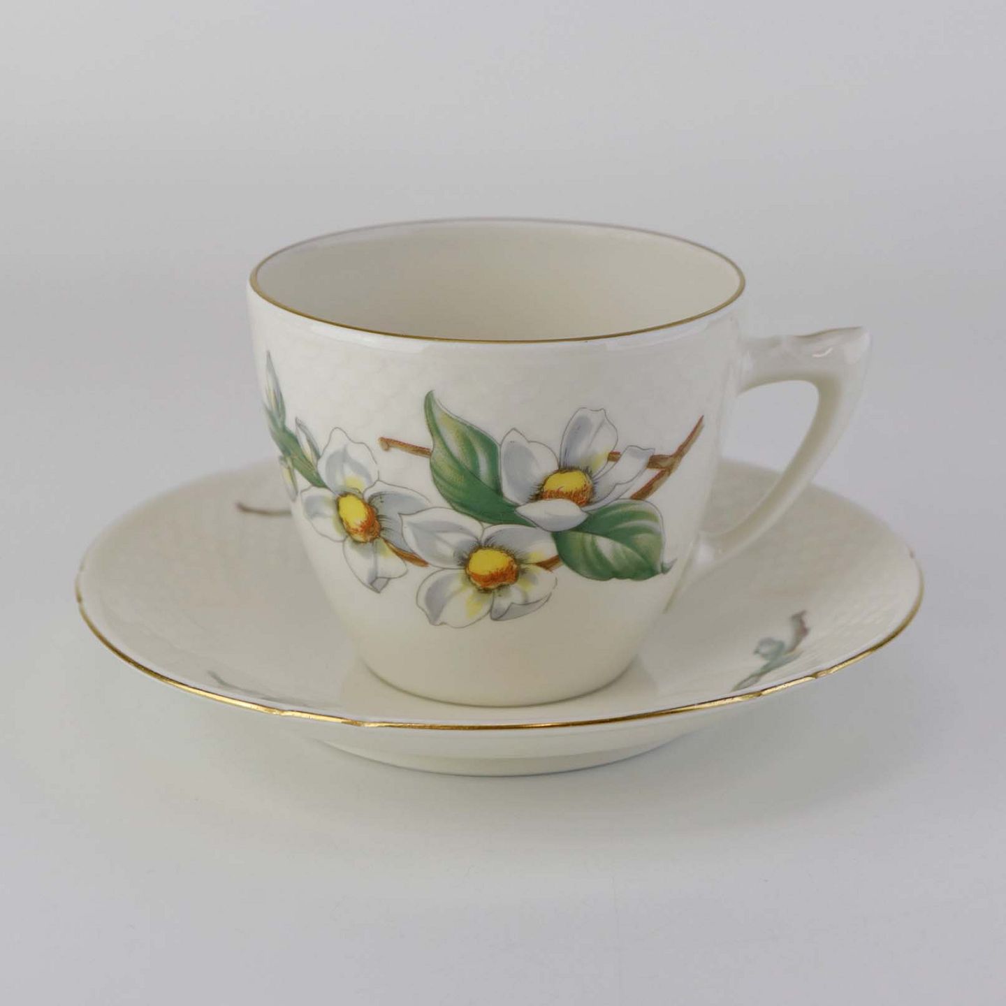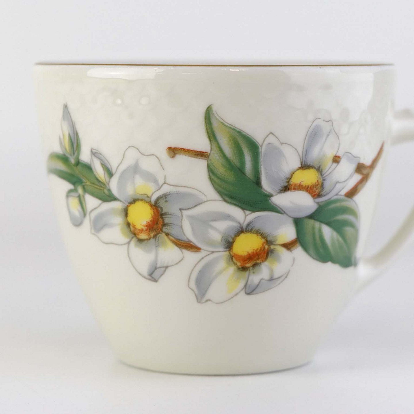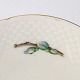 Heimdal er cremefarvet porcelæn i skælform, som dekoreret med jasminblomster, grene og en guldkant.
