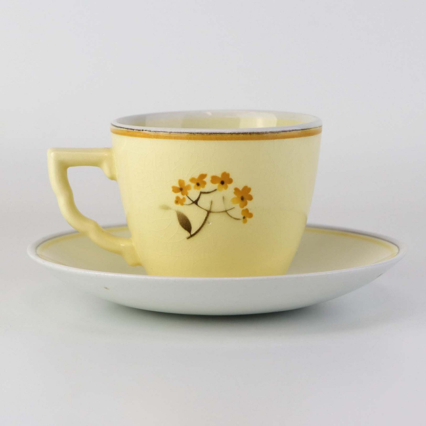Stel i glat gul fajance med dekoration af farverige og forskelligartede blomster samt med gul og sort kantstreg.