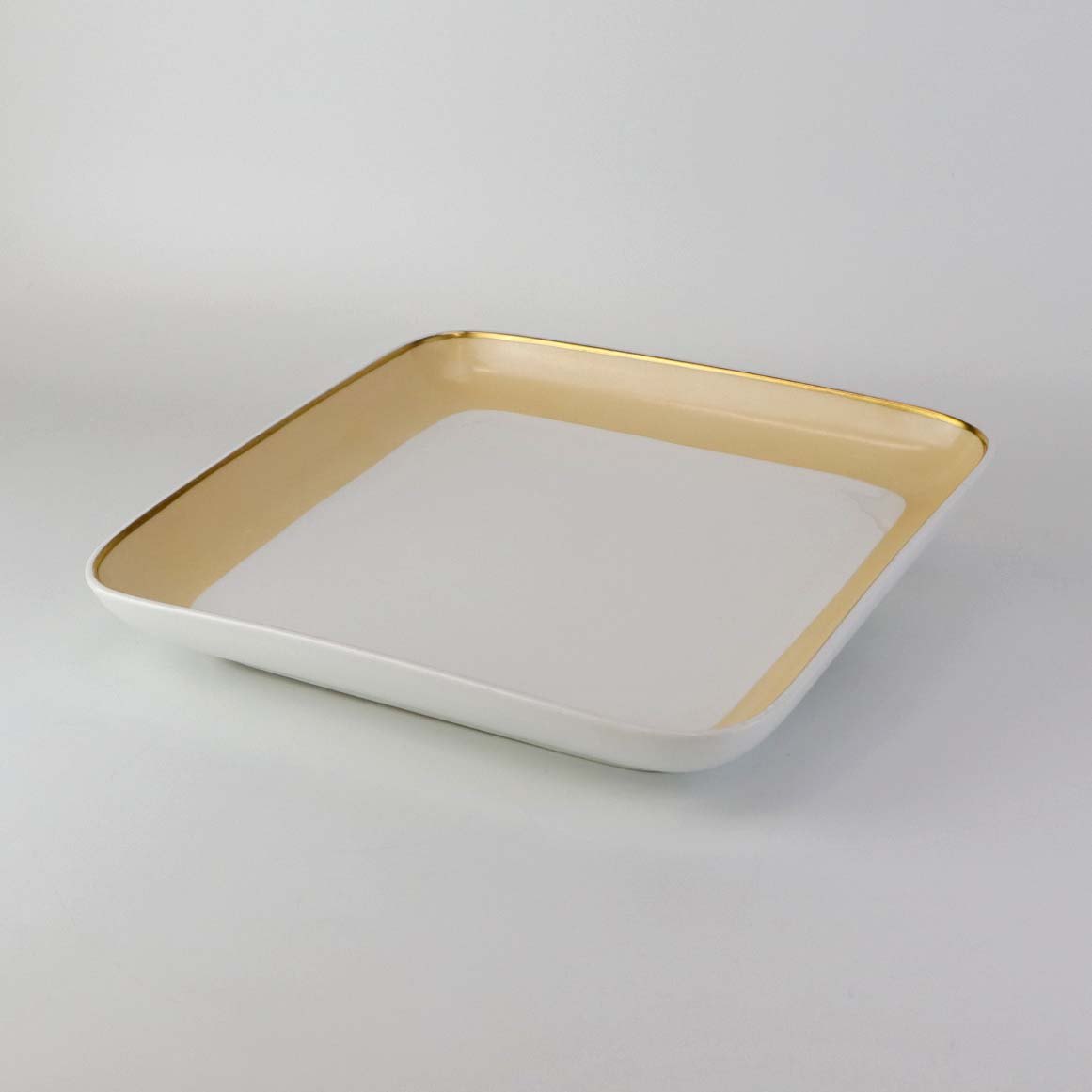 Service i glat hvid porcelæn med sandfarvet dekoration og gylden kant.