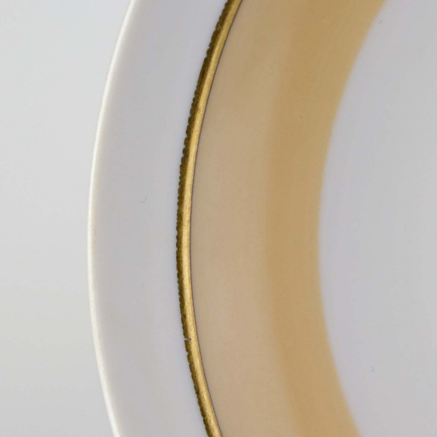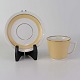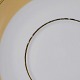 Service i glat hvid porcelæn med sandfarvet dekoration og gylden kant.