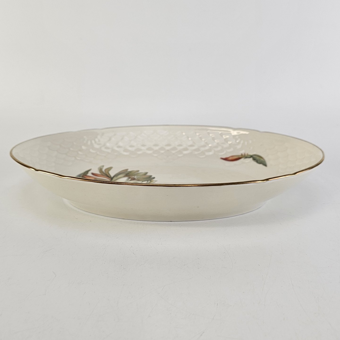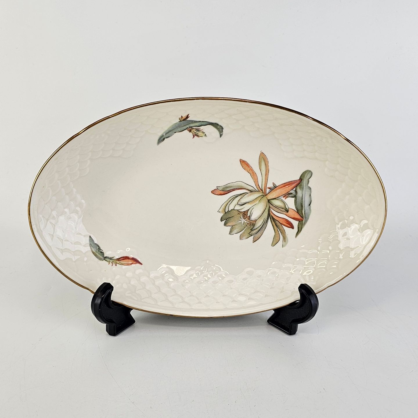 Kaktus er cremefarvet porcelæn i skælform, dekoreret med kaktusblomster og guldkant