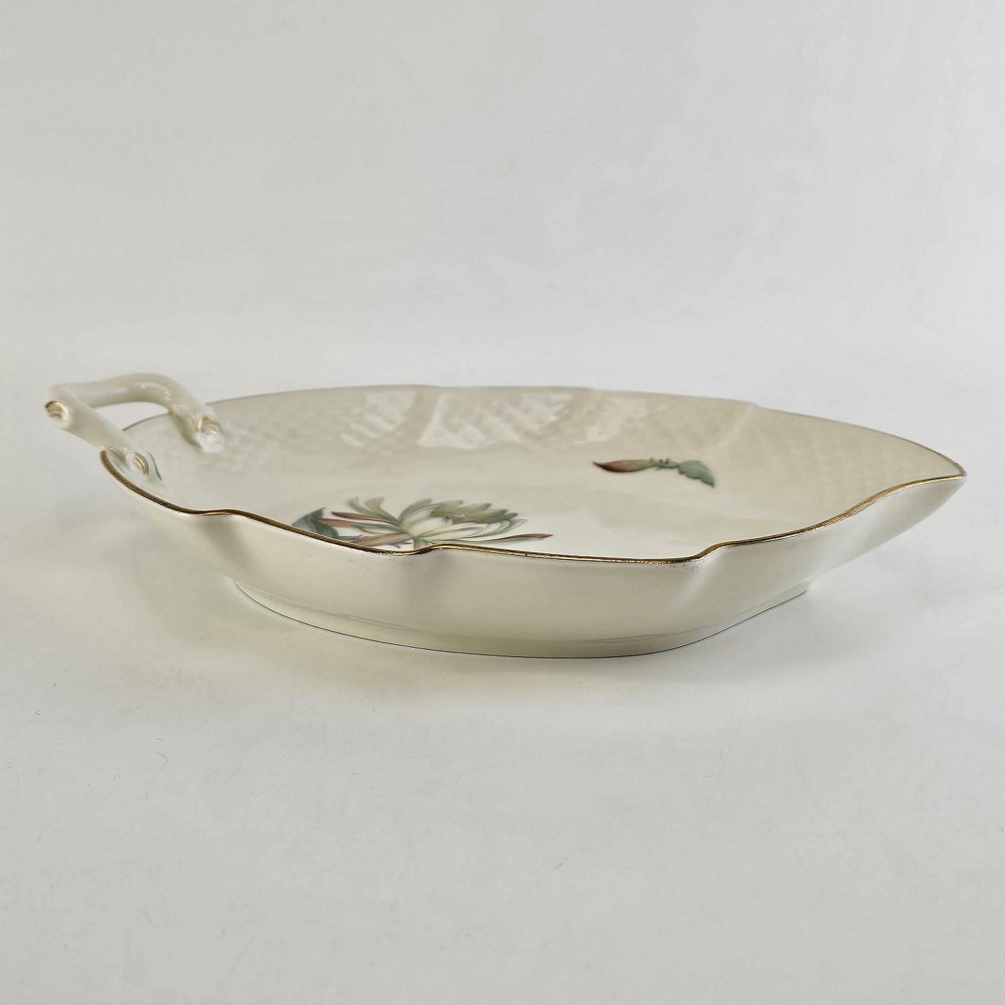 Kaktus er cremefarvet porcelæn i skælform, dekoreret med kaktusblomster og guldkant