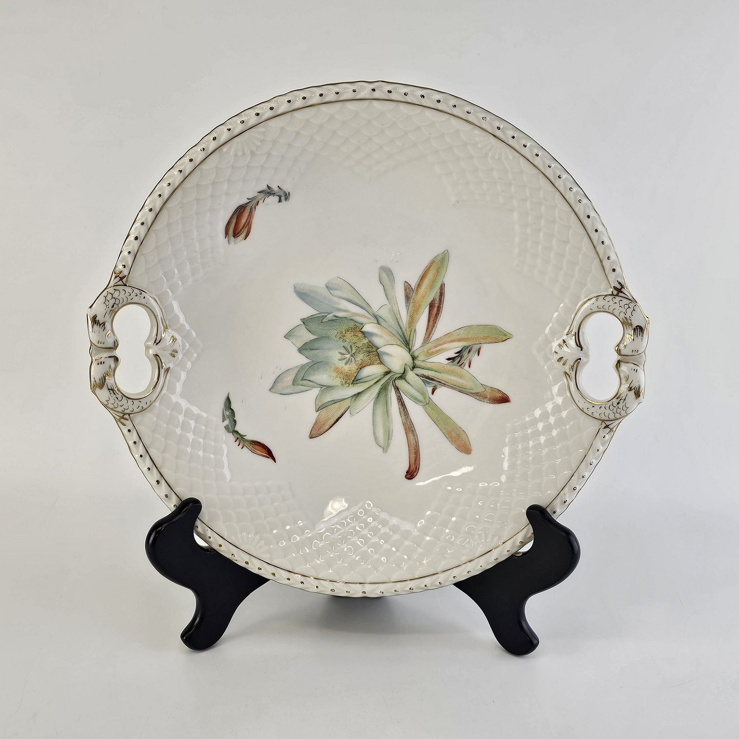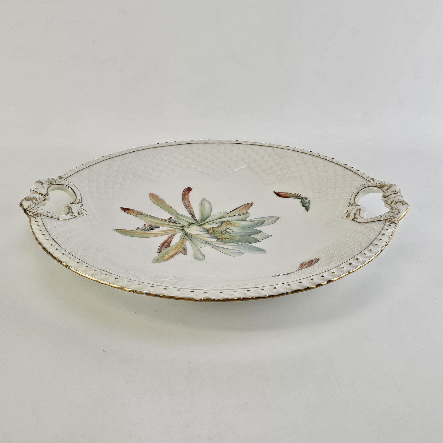 Kaktus er cremefarvet porcelæn i skælform, dekoreret med kaktusblomster og guldkant