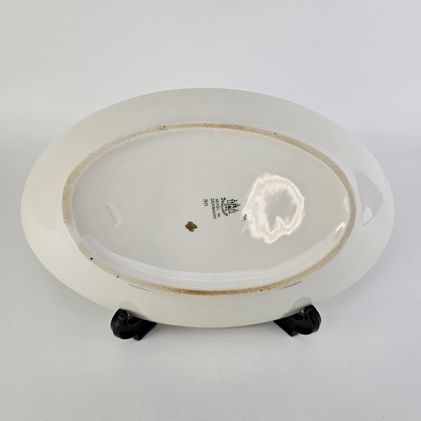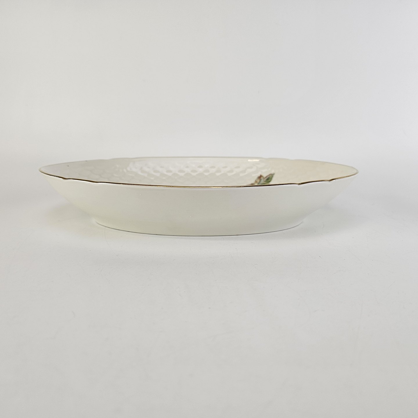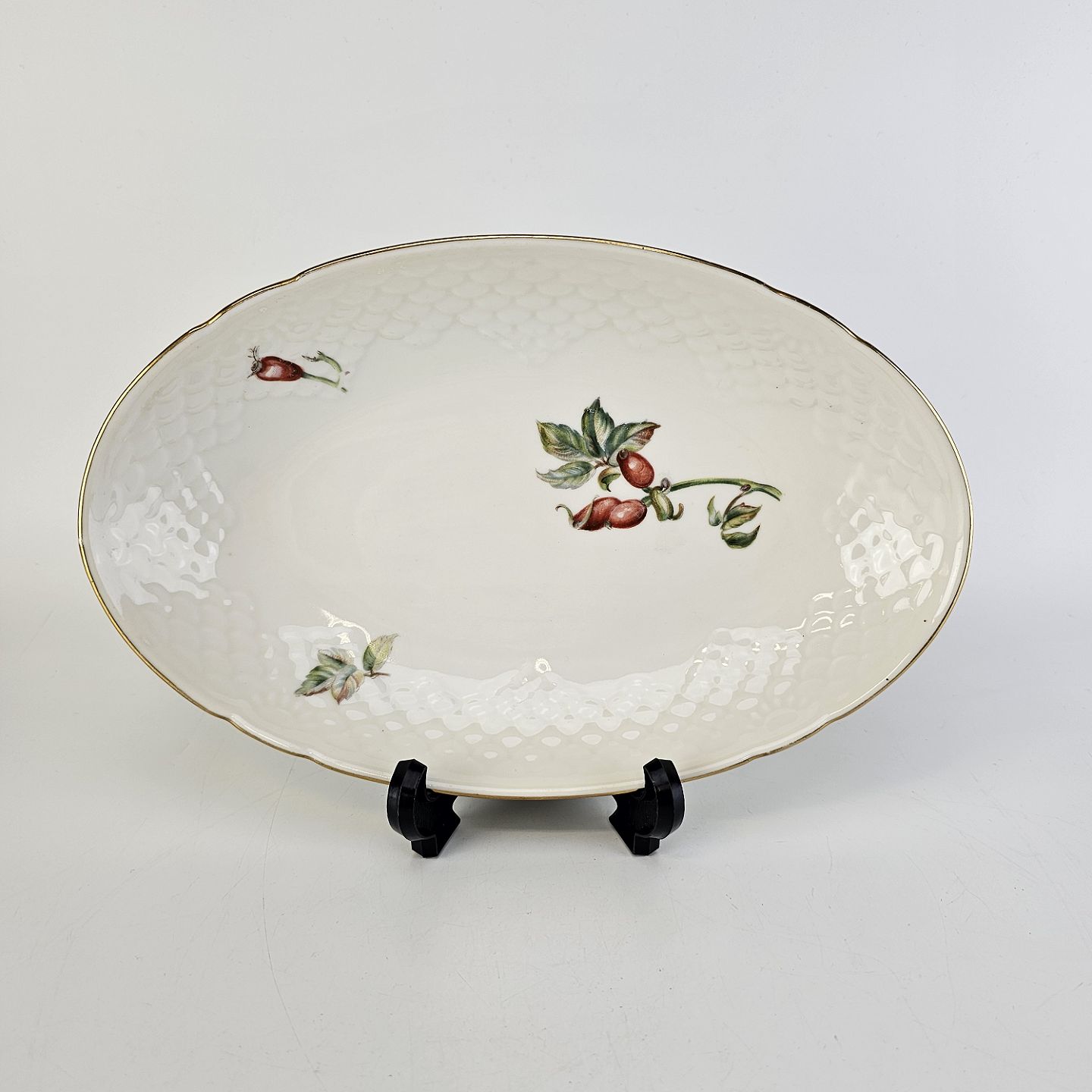 Balder er cremefarvet porcelæn i skælform, dekoreret med hyben og guldkant.