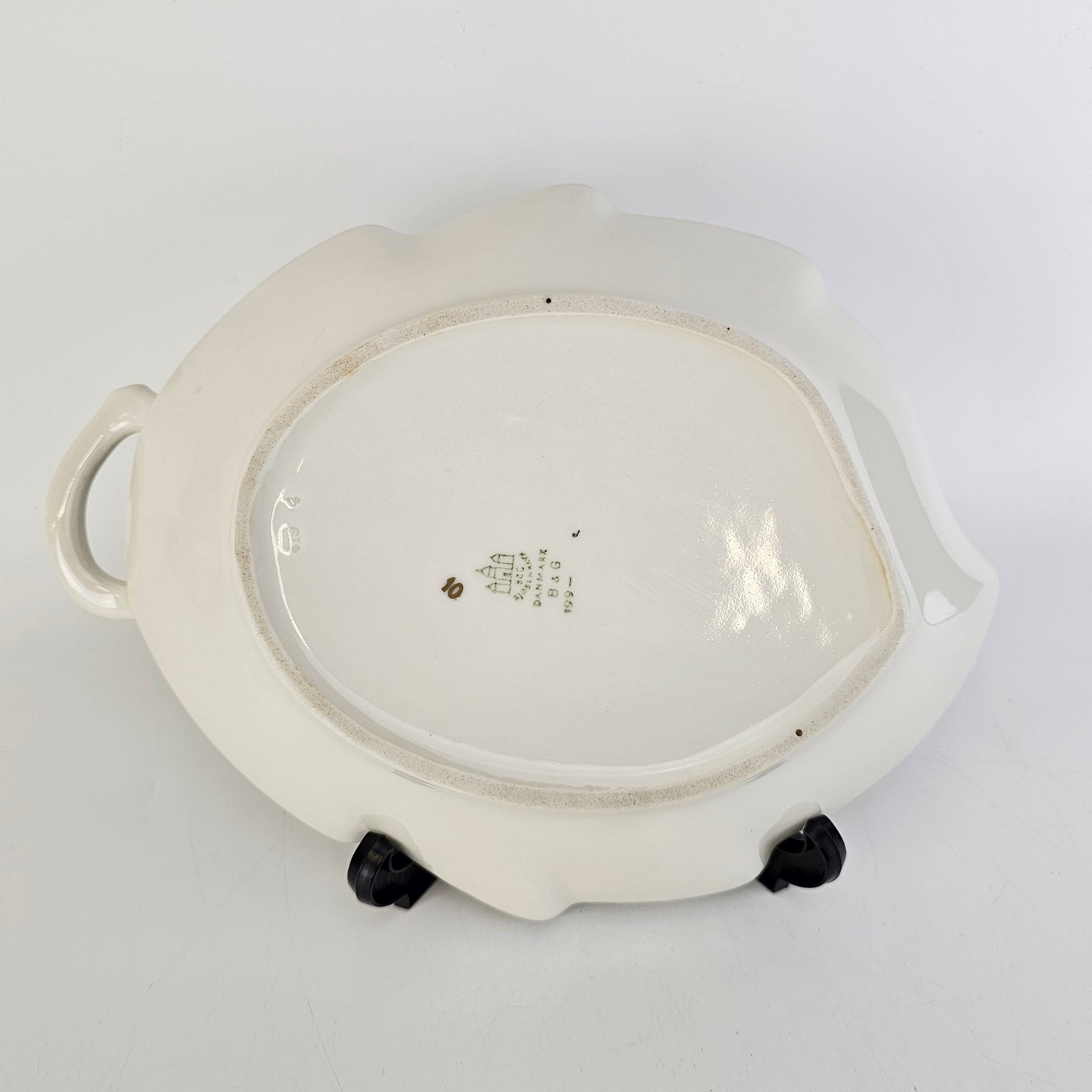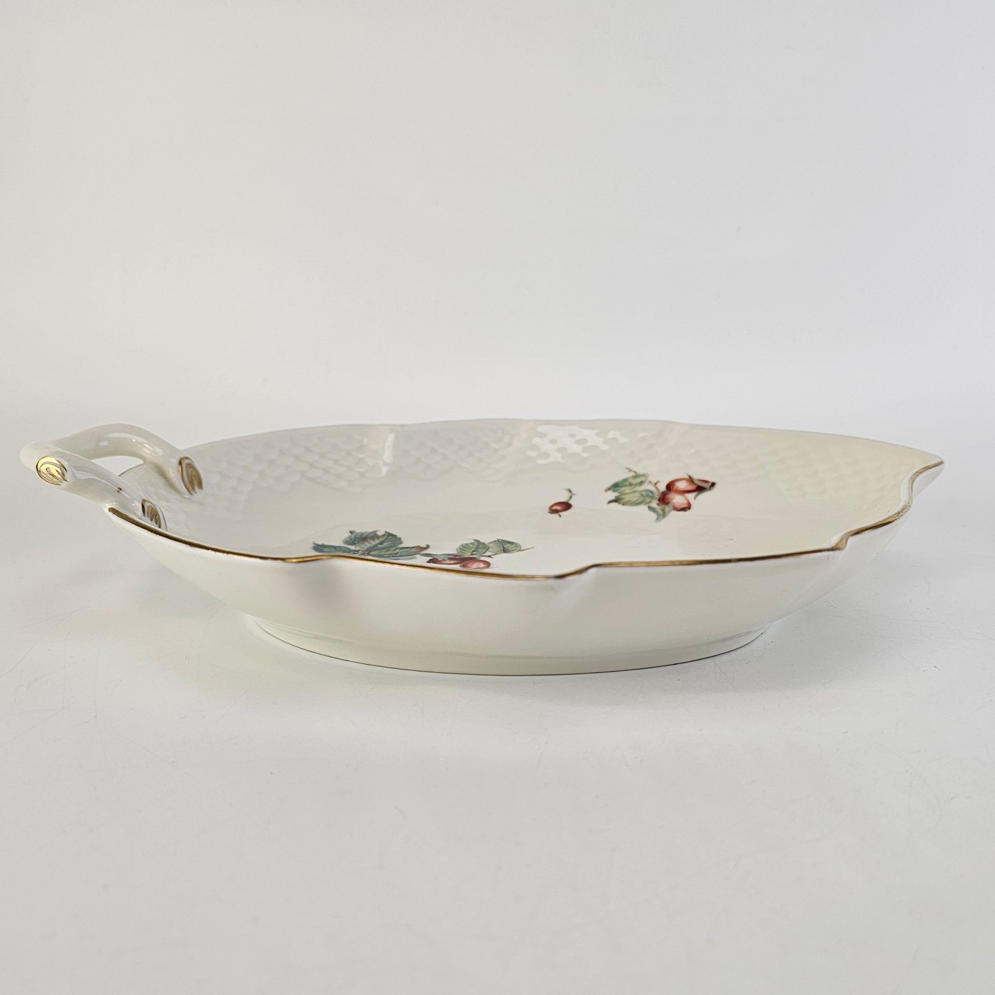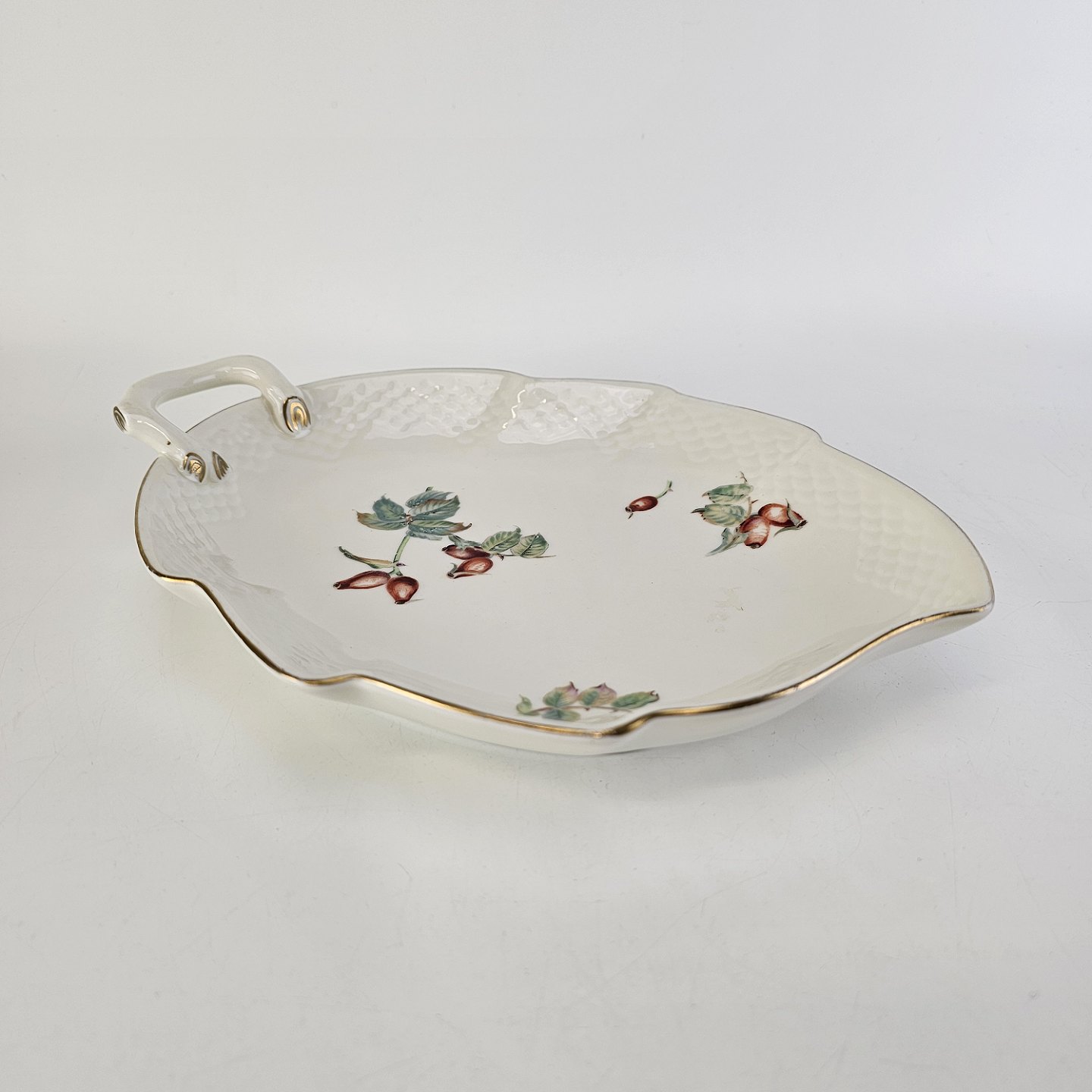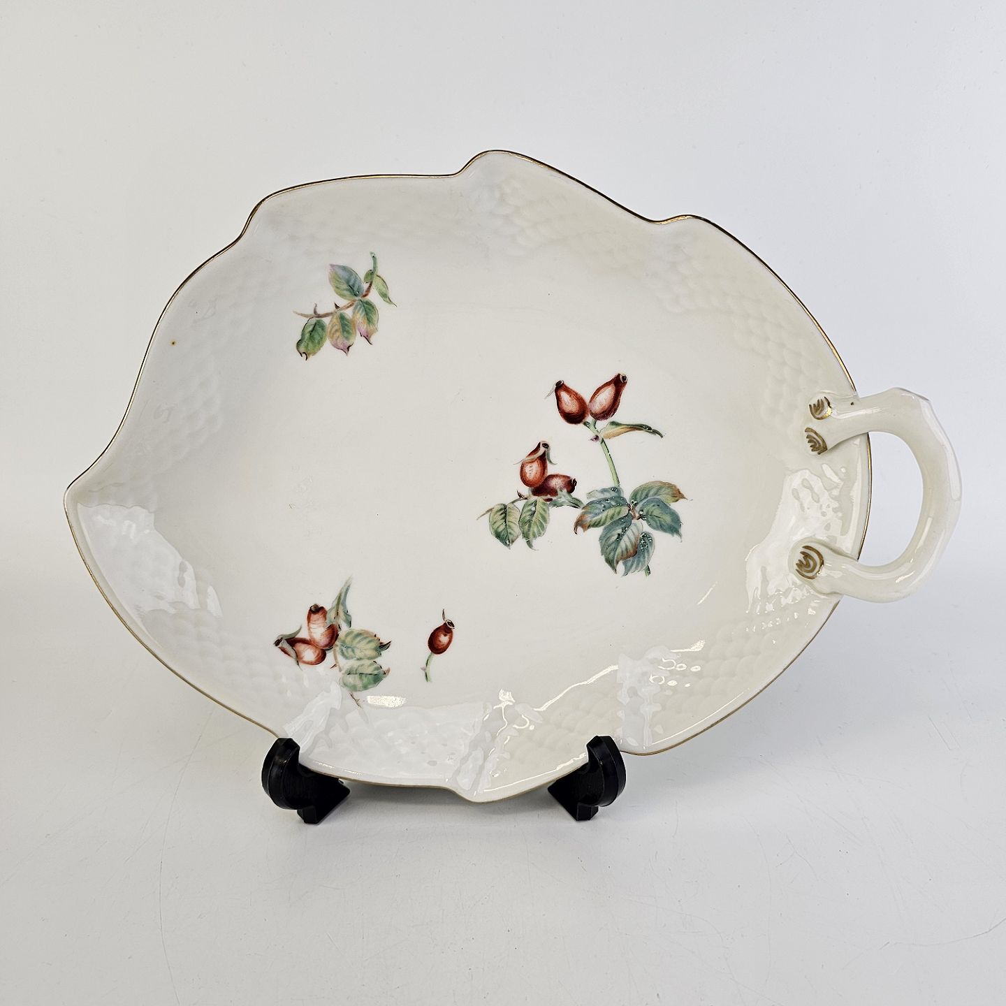 Balder er cremefarvet porcelæn i skælform, dekoreret med hyben og guldkant.
