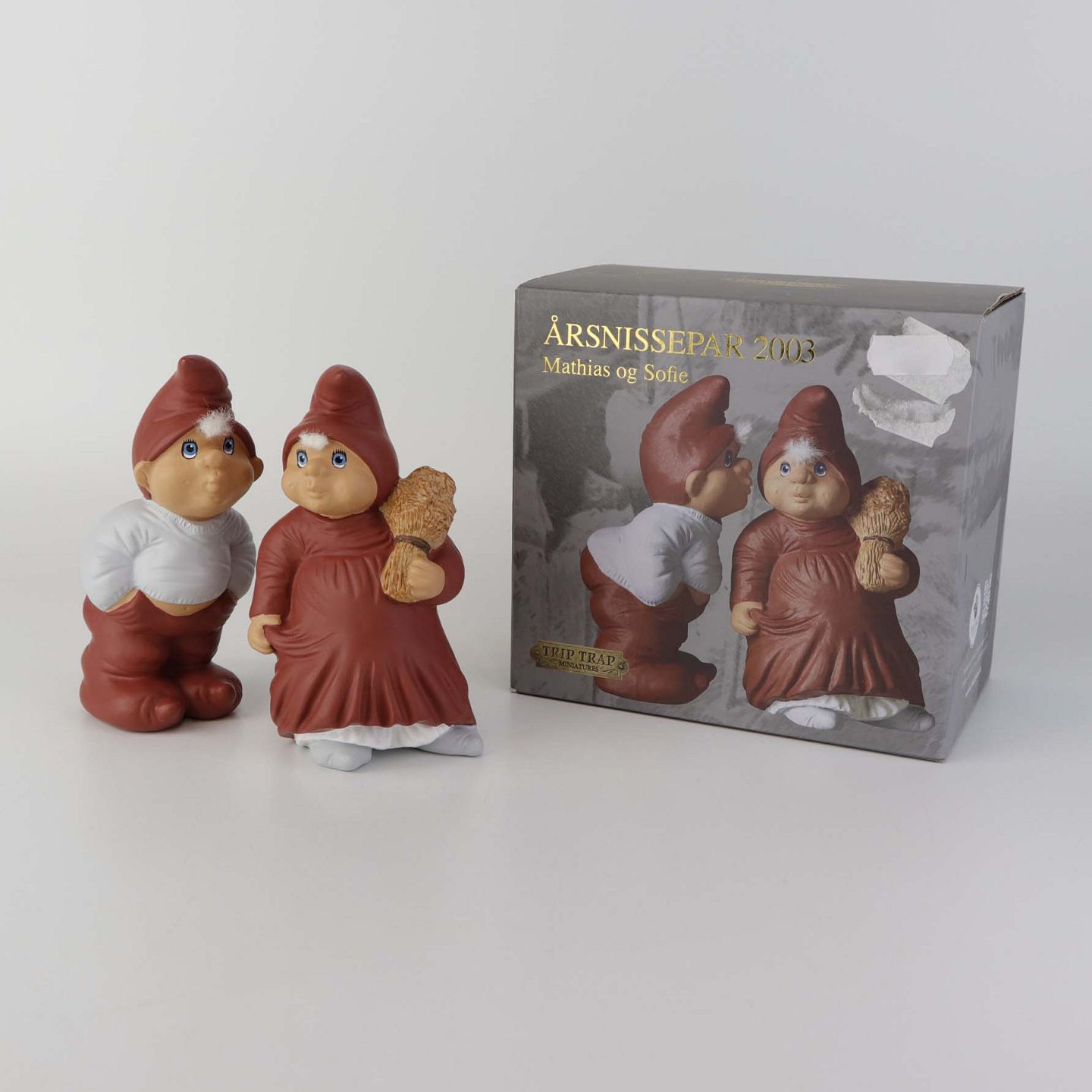 Figursæt med motiv Mathias og Sofie, som er årsnissepar fra år 2003 fra serien Klarborg jul. Figurene kommer med original boks.