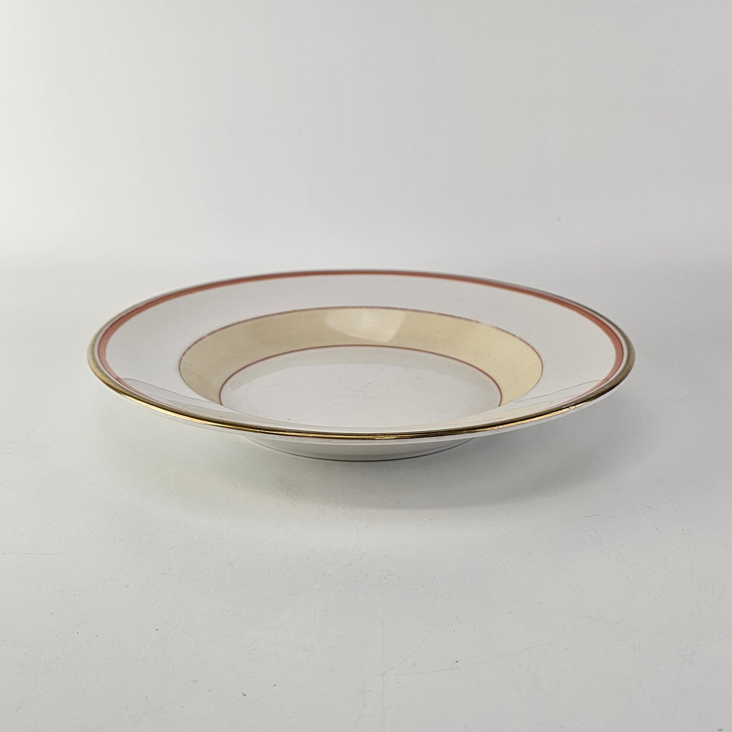Service i glat hvidt porcelæn pyntet med dekoration i beige, brændt orange og gylden streg.