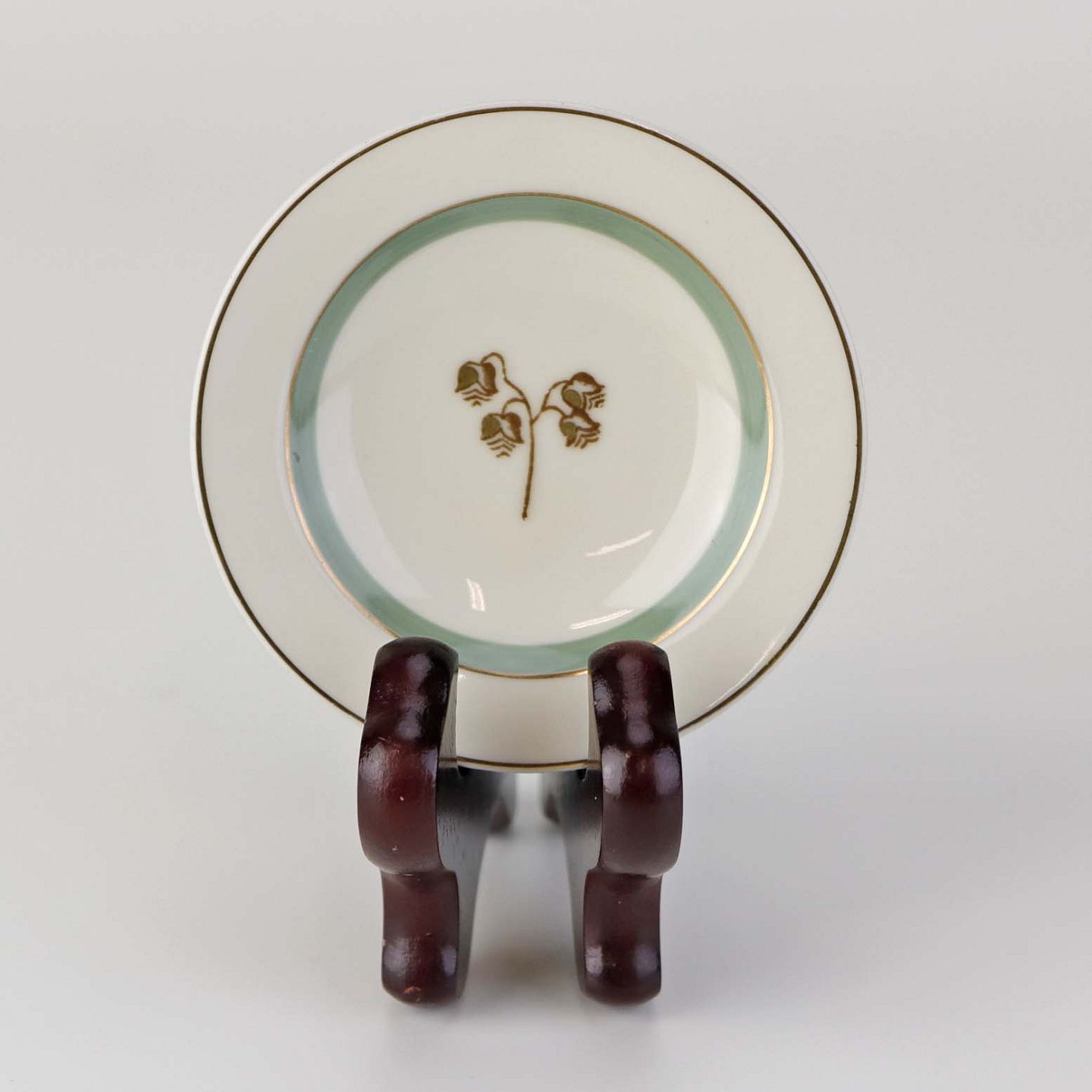 Stel i glat råhvidt porcelæn dekoreret med lysegrøn stribe og guldkant samt motiv af hjertegræs.