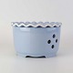 Service i lyseblå fajance dekoreret med tynd hvid kant.