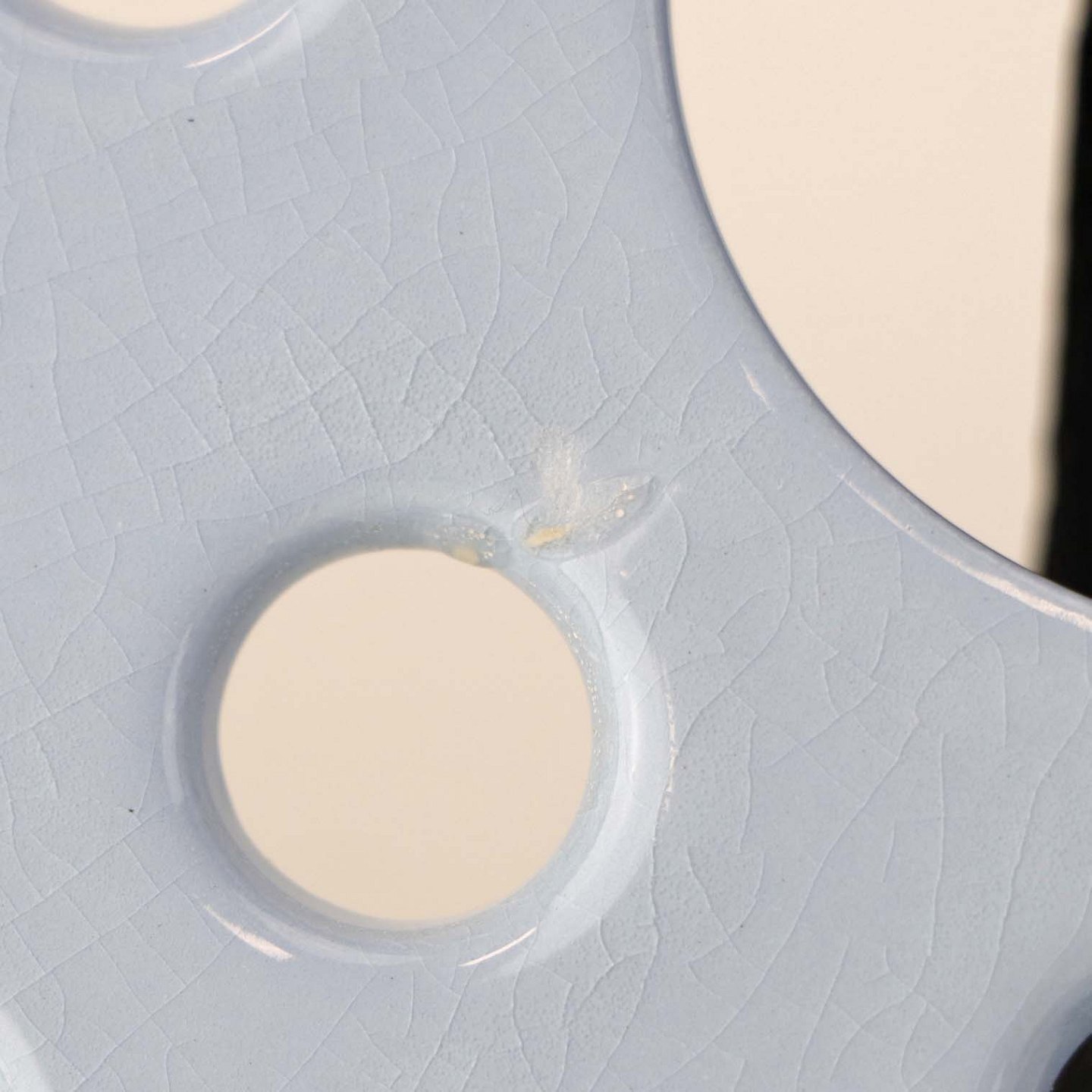 Fremstår med krakkeleringer i glasuren, mindre rest af tape, ujævnhed i glasuren under topfladen samt brugsspor på topkanten.