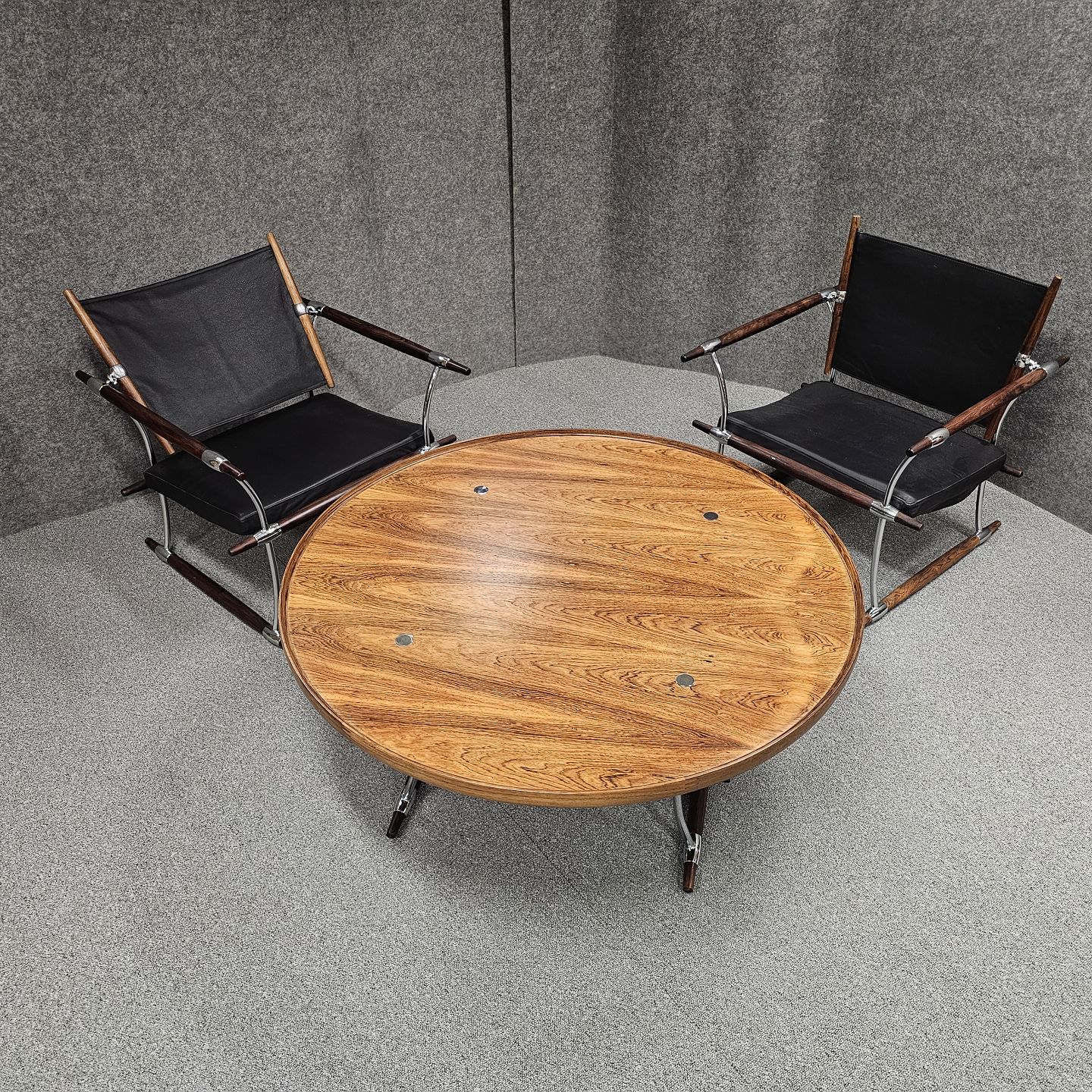 Stokkebord ligeledes med stel i palisander og forkromet stål og med bordplade af palisander.