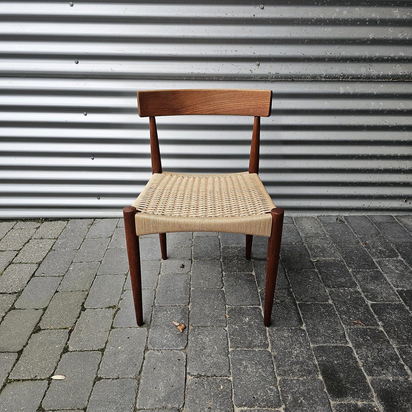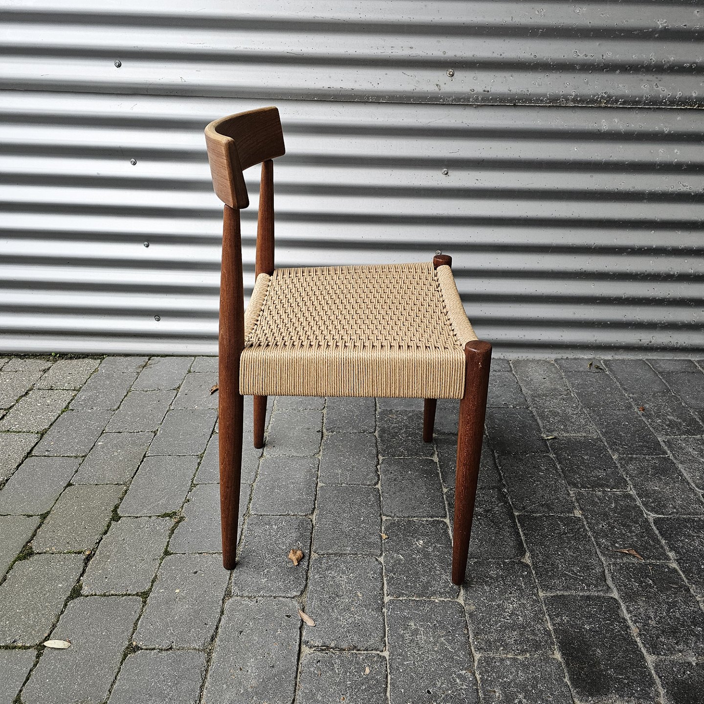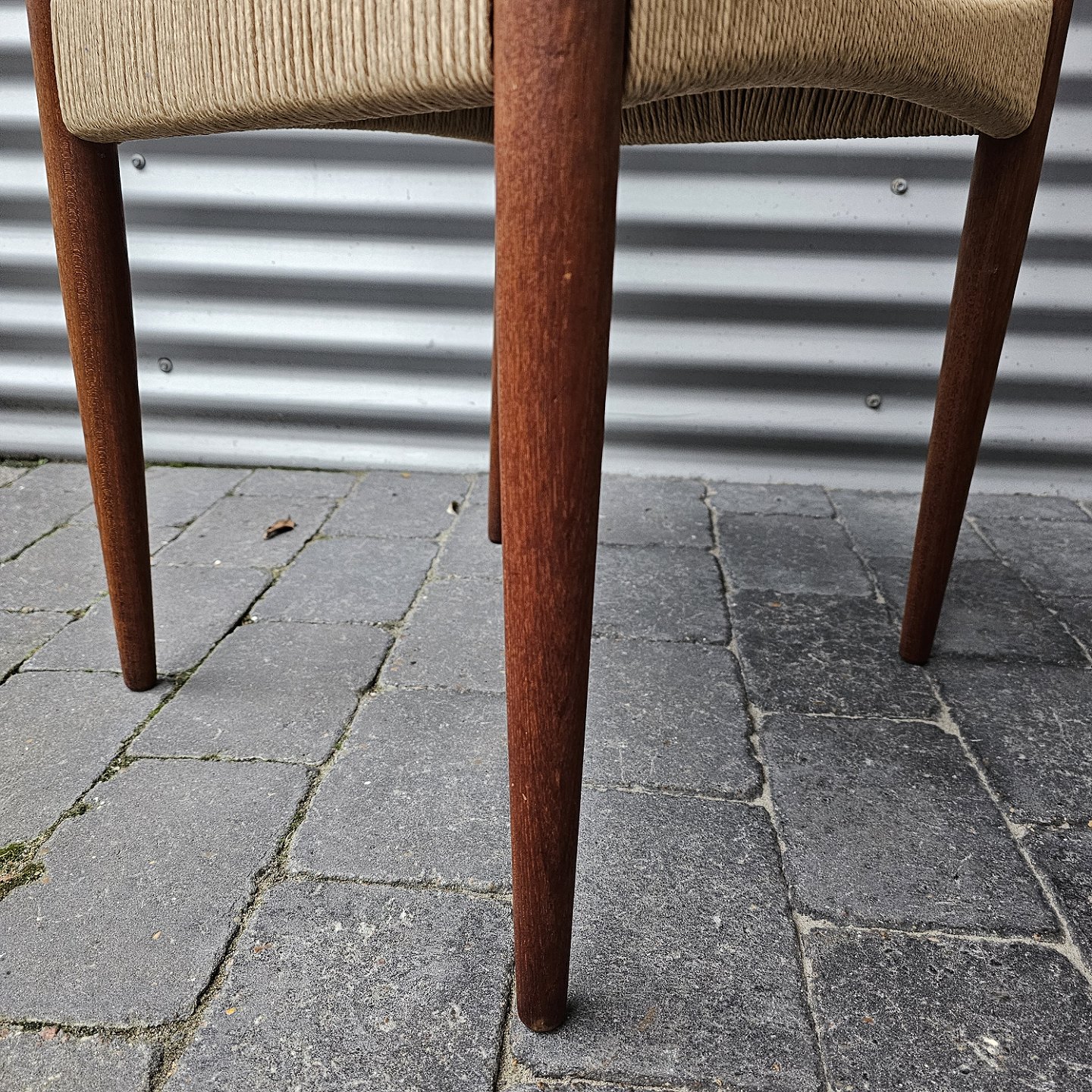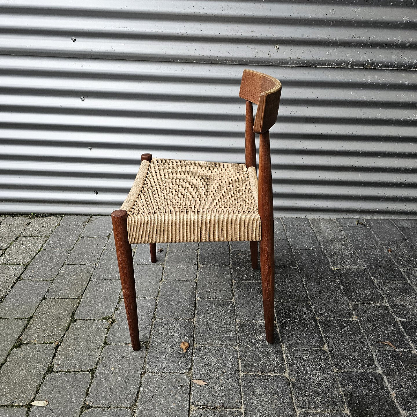 4 spisebordsstole i teak med nyflettet sæder, originalt bundet.