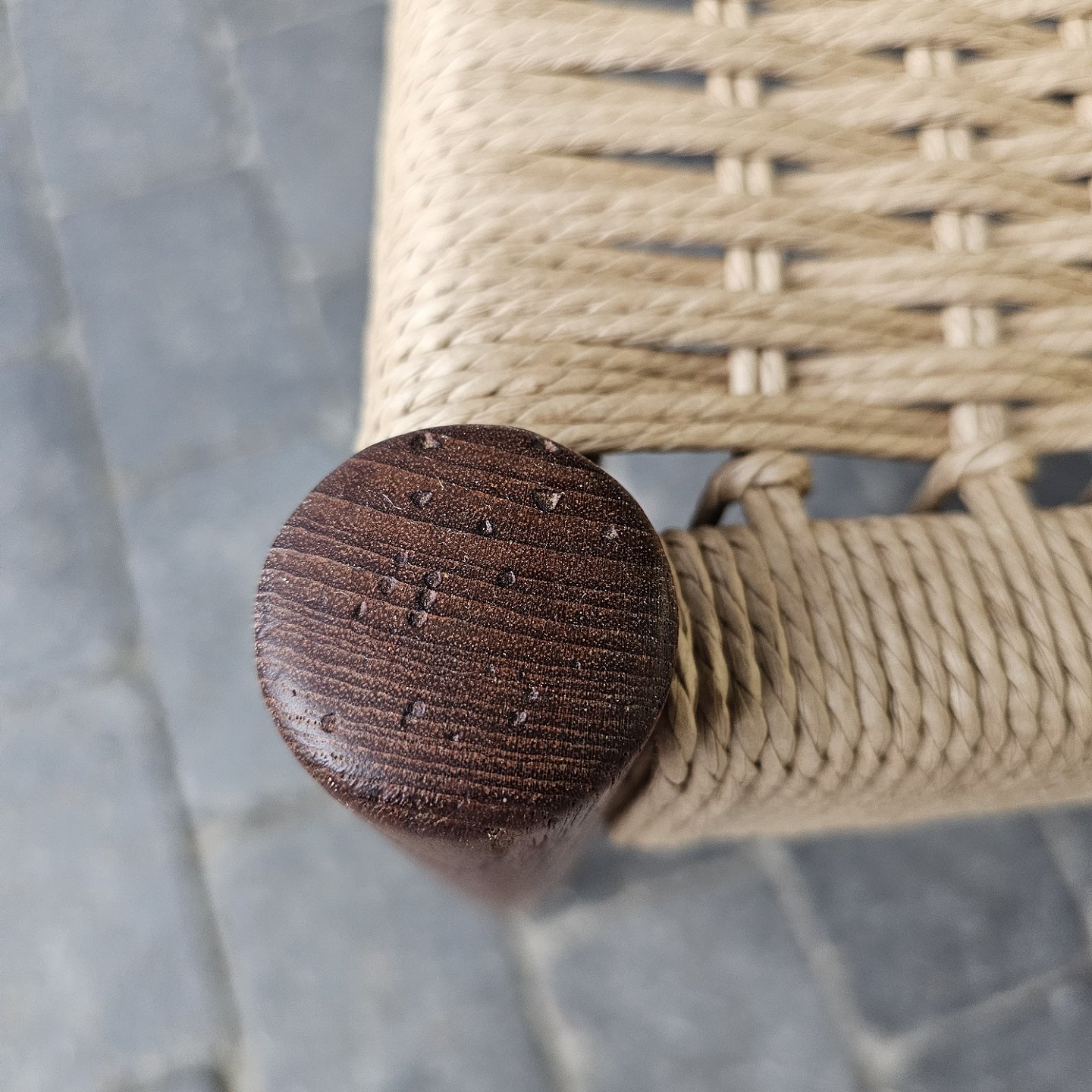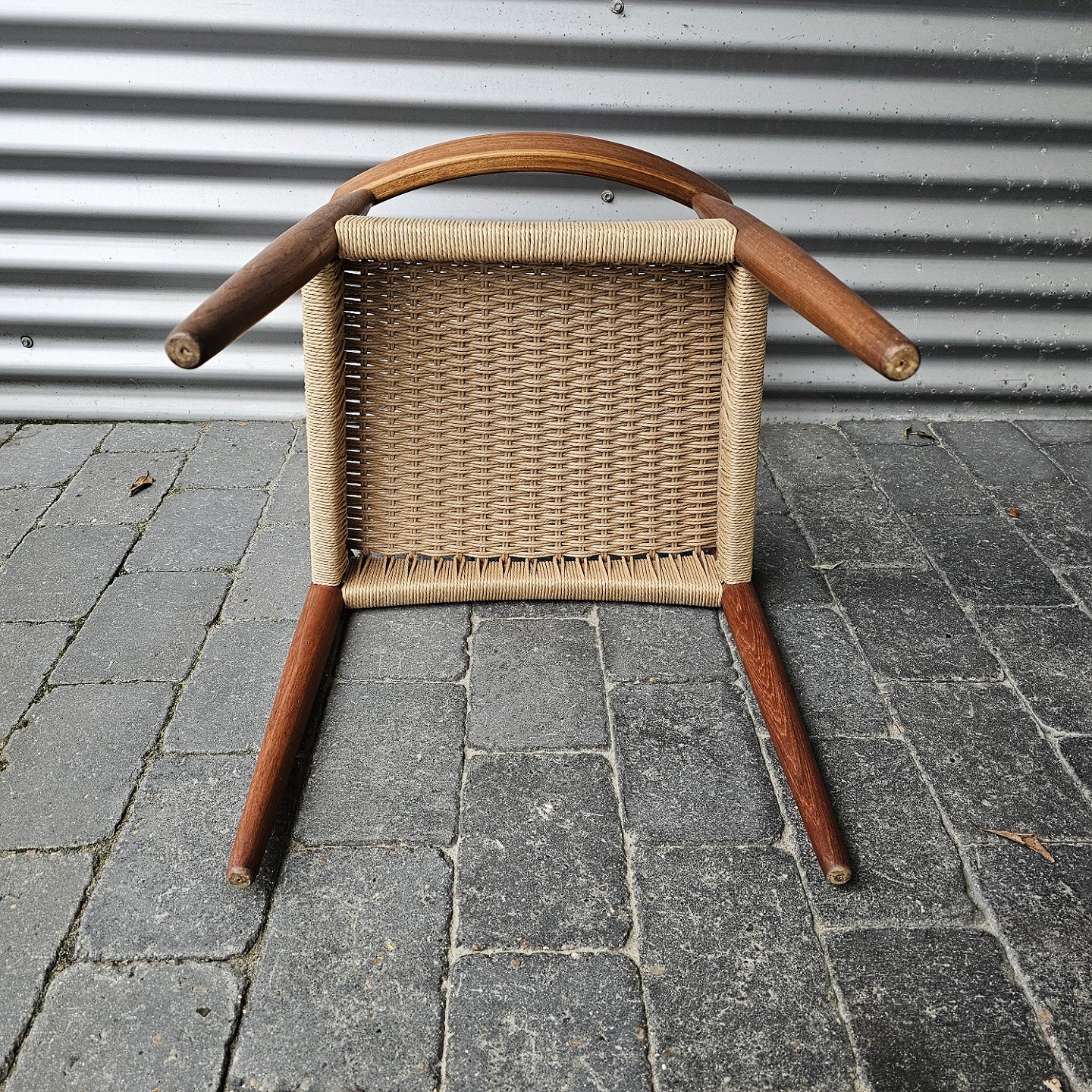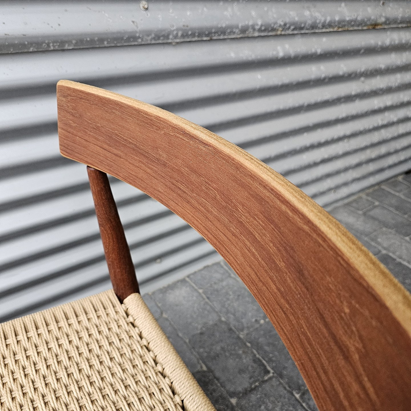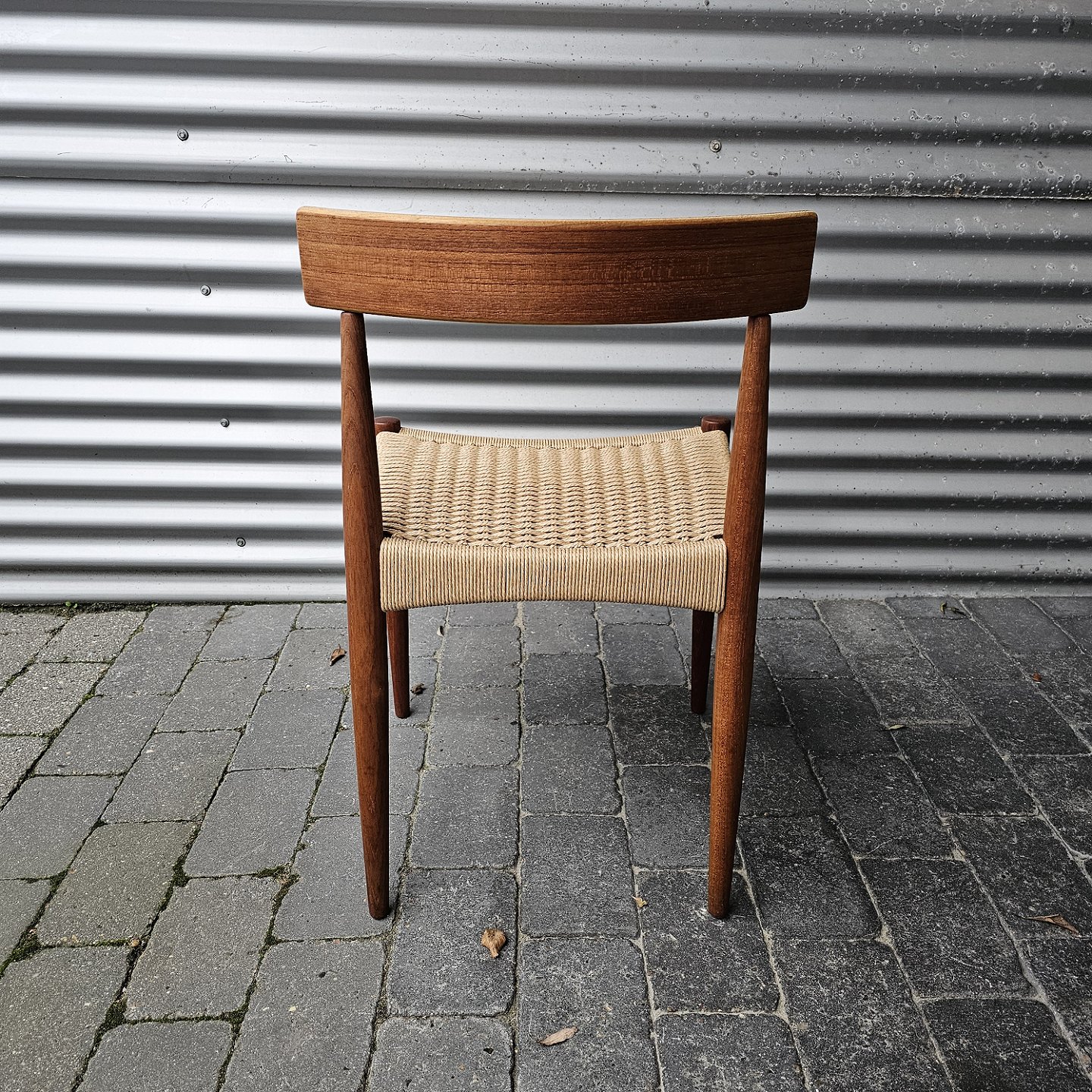 4 spisebordsstole i teak med nyflettet sæder, originalt bundet.