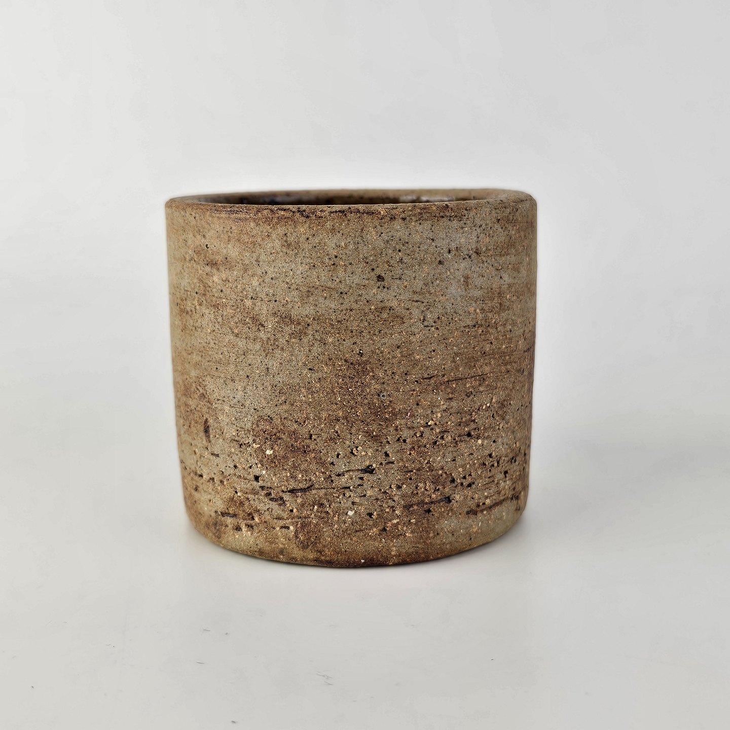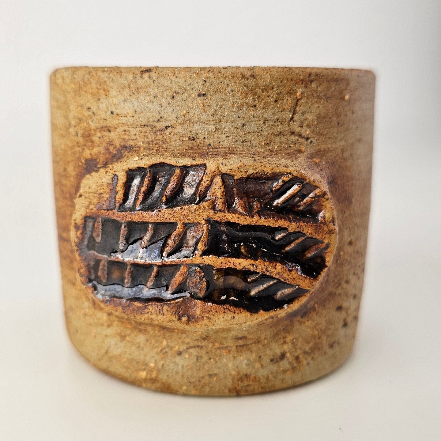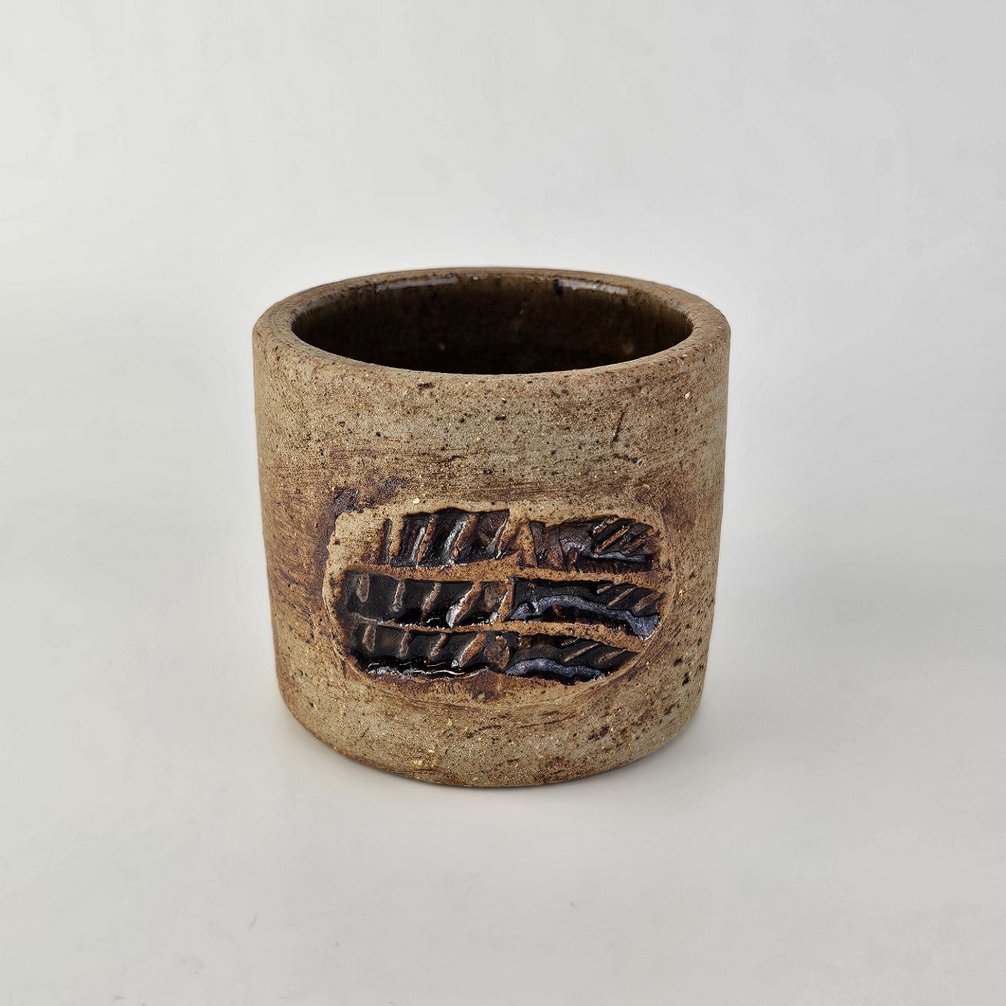 Brunlig krukke, krus, kop, vase med lille relief udvendigt. Den er uglasseret udvendigt