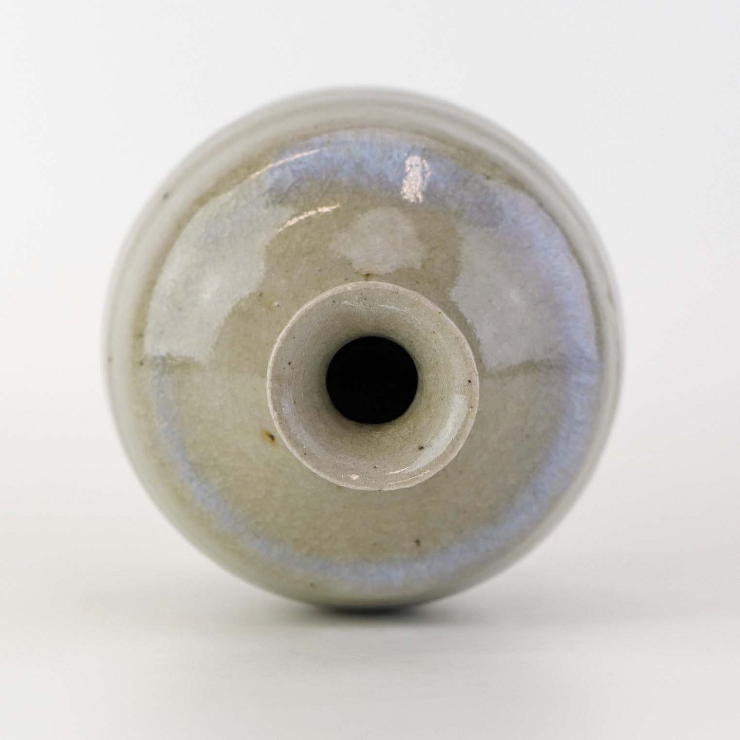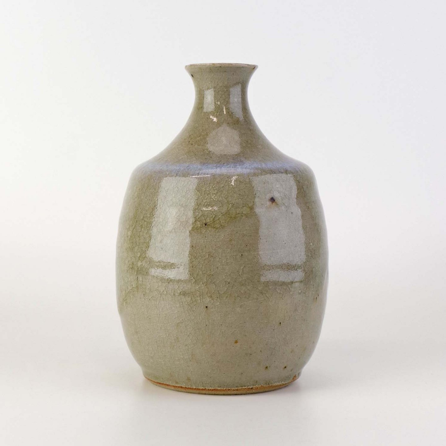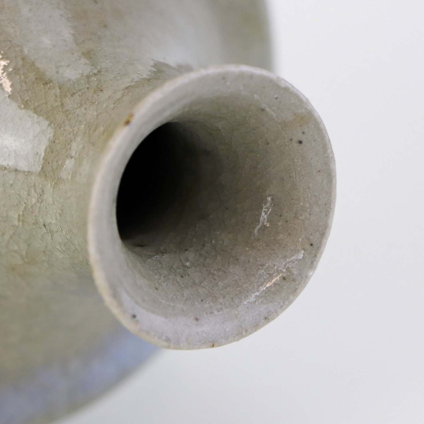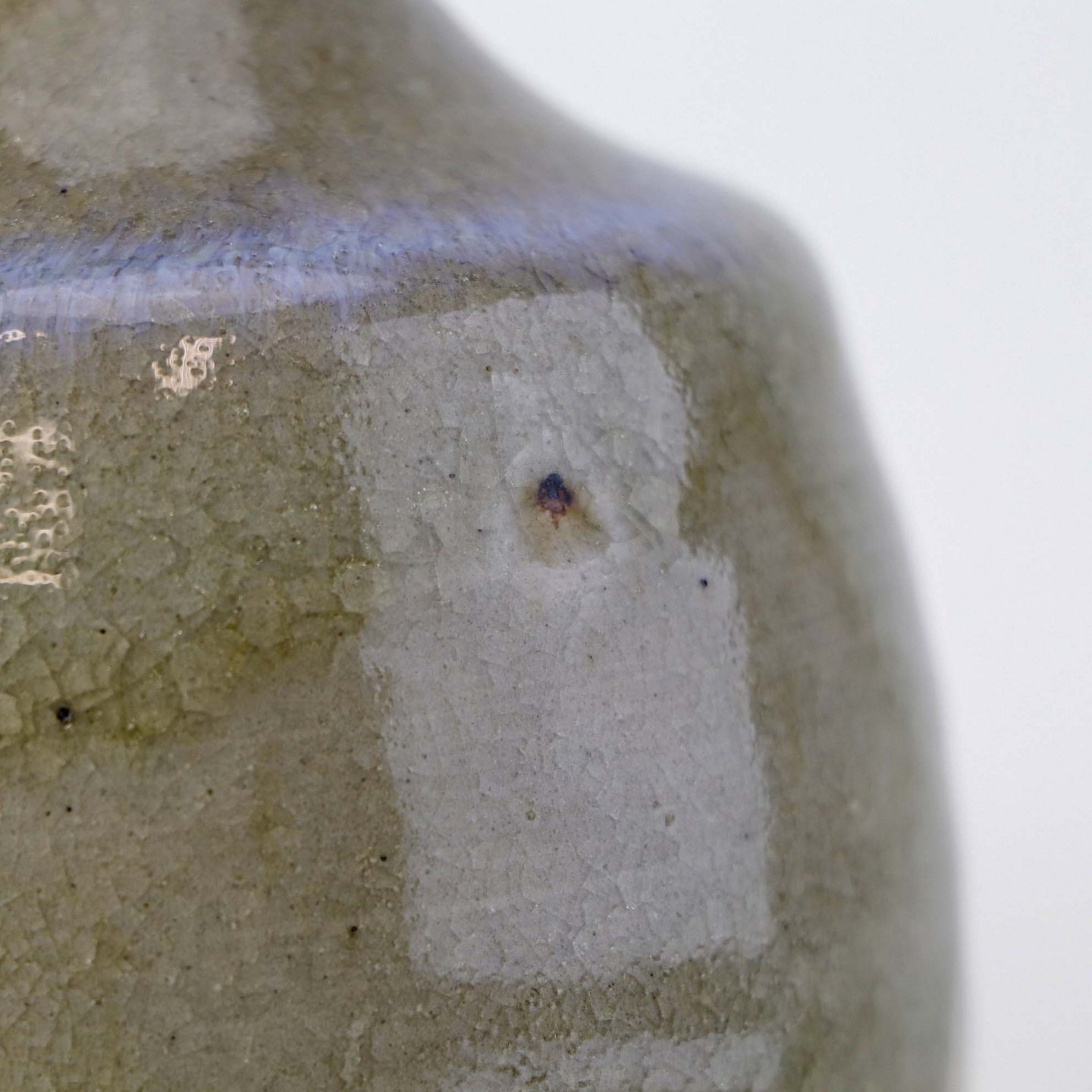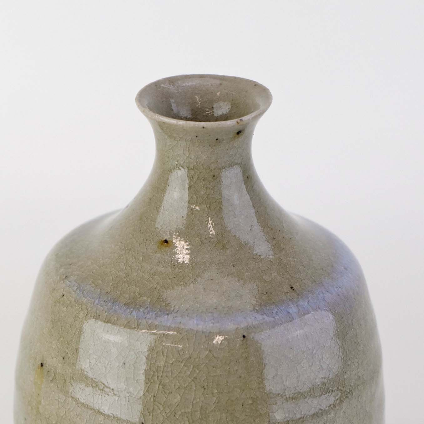 Vase i stentøj med beigefarvet glasur med mørke nister og krakkeleringer samt med en fremhævet blå kant.