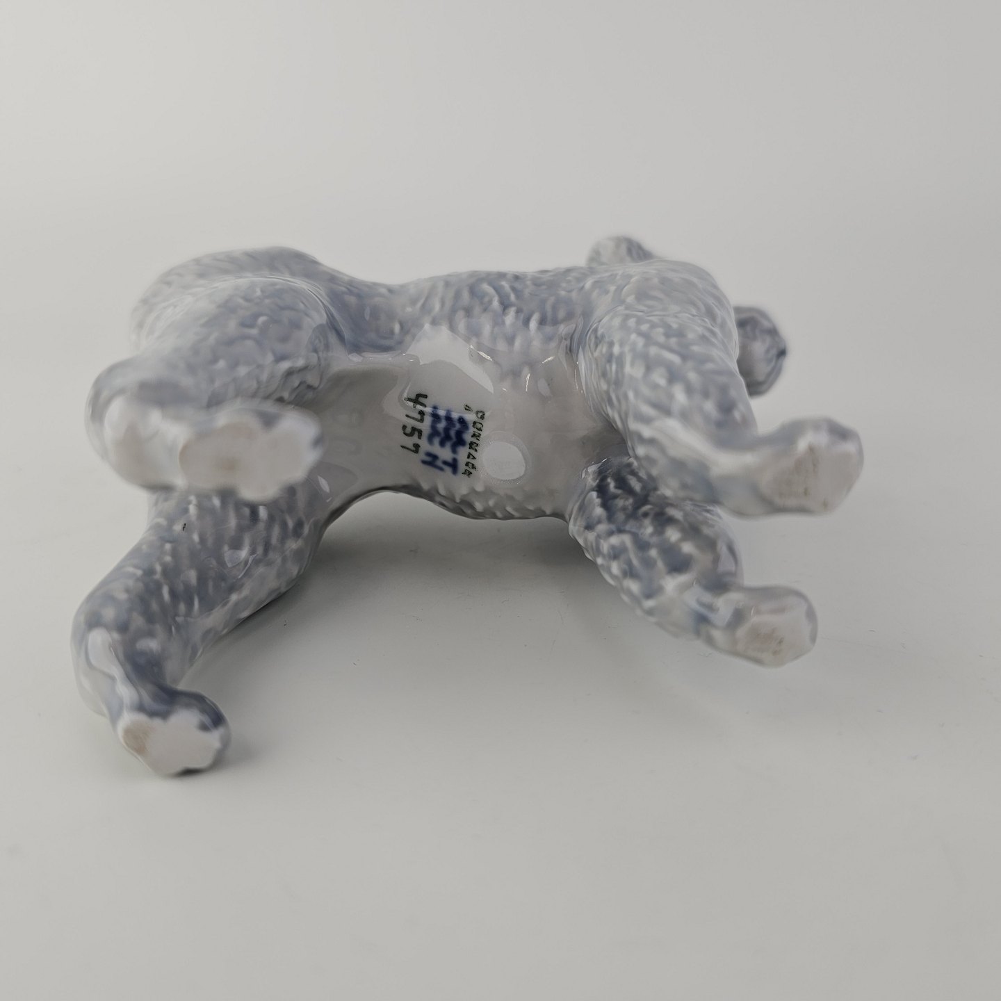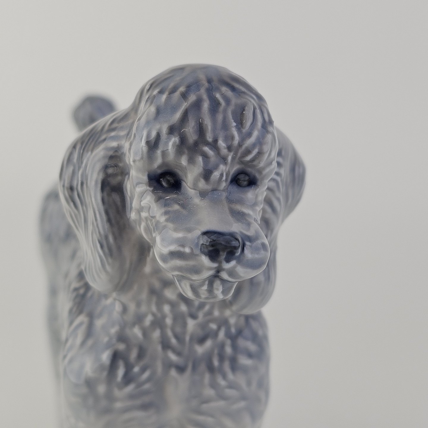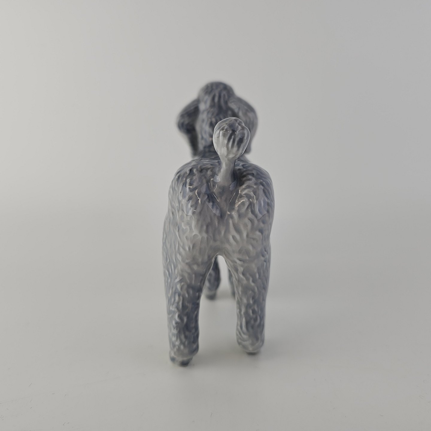 Figur i kongeligt porcelæn med form af en stående grå puddelhund