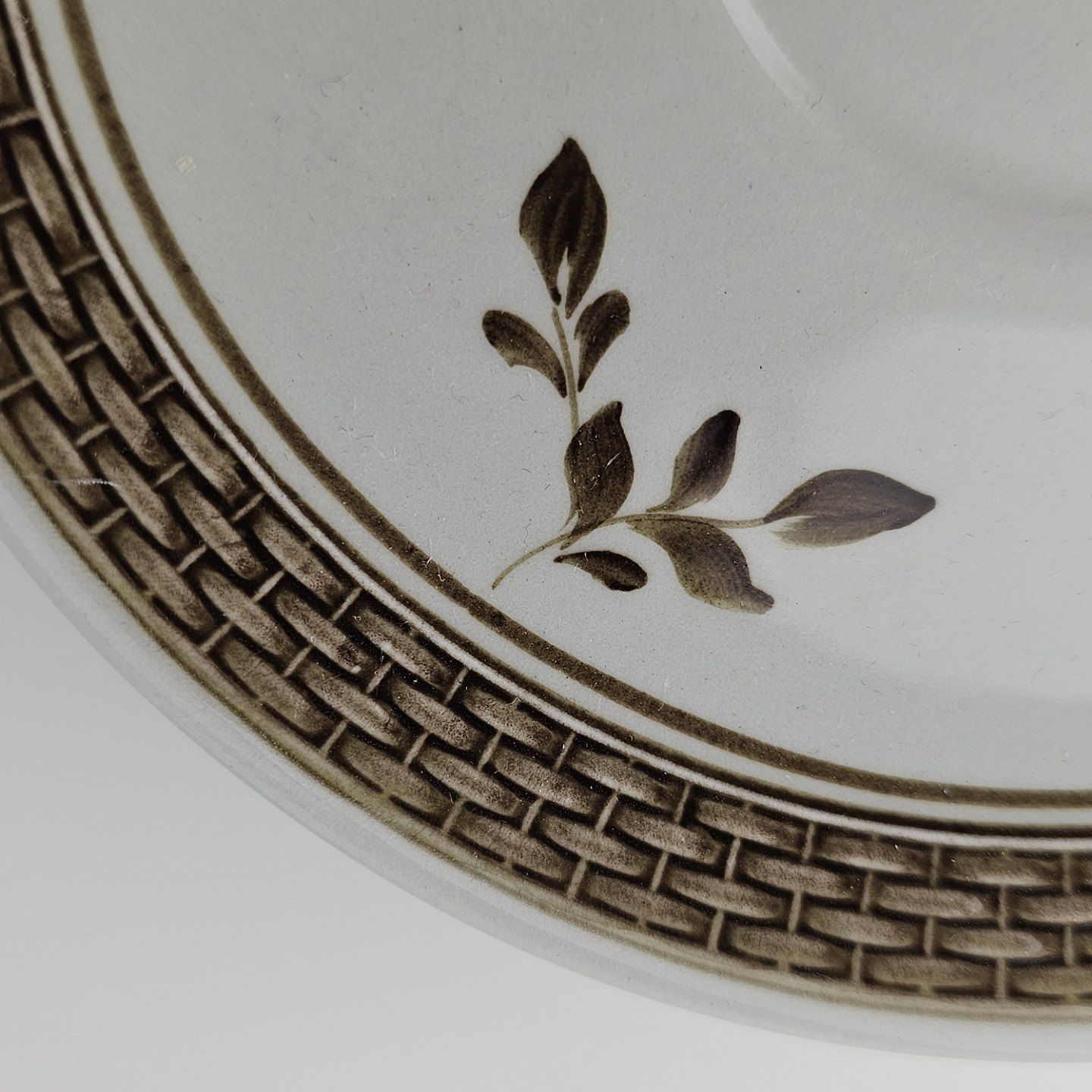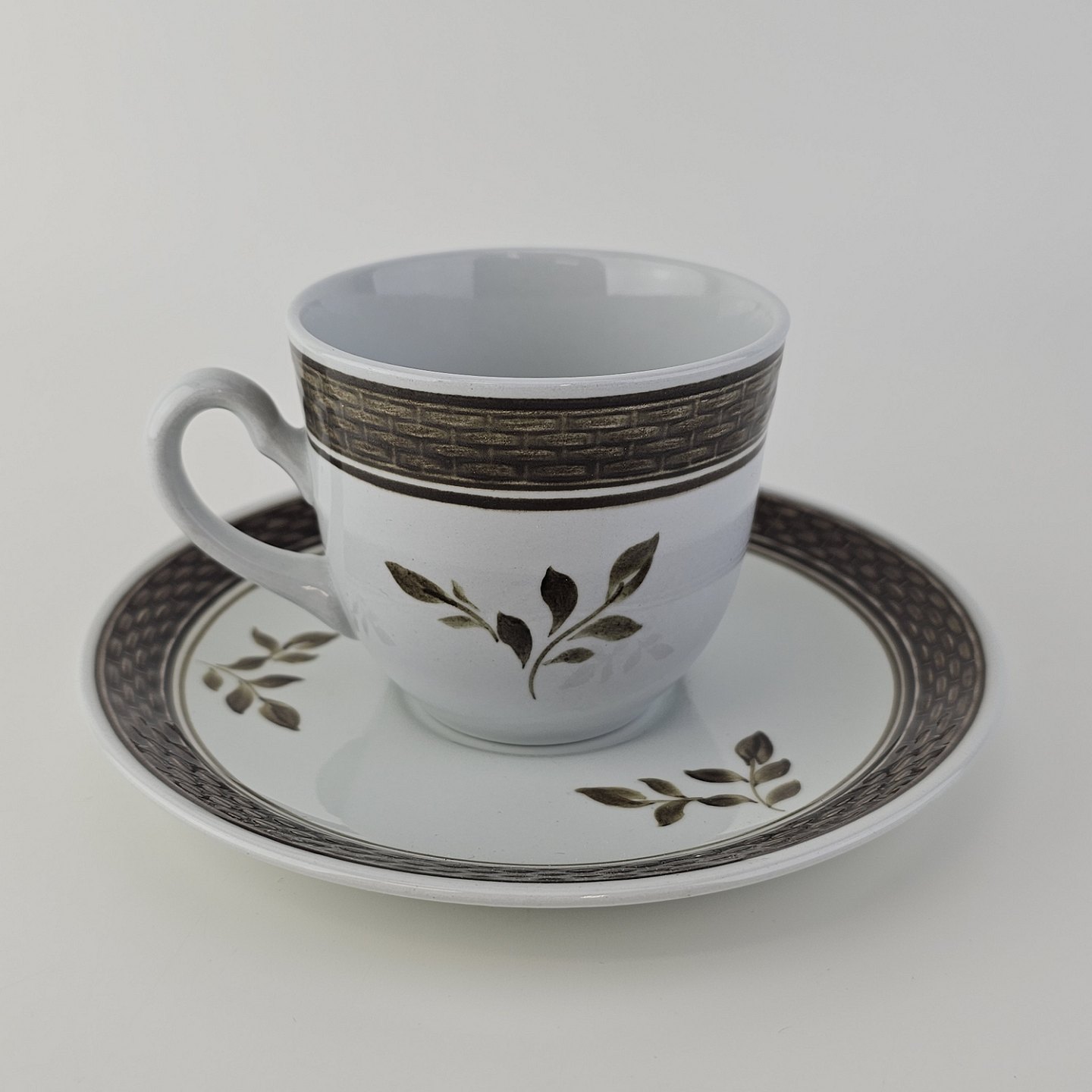 Fajancestellet med flettet kant og dekoration af brune blomster på lys baggrund med brun kant