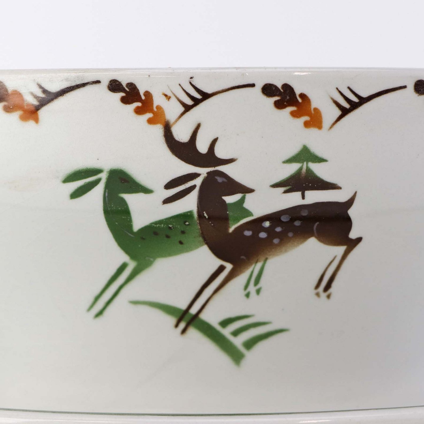 Fajancestel i stelform C med dekoration af grøn og brun hjort på lys baggrund med kantbort af blade i brune nuancer.