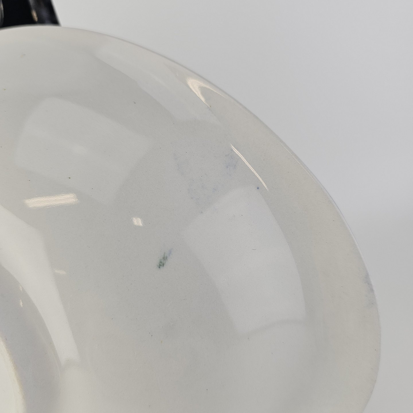 Hvidt fajancestel i stelform Sterling med motiv af blå blomster og blå prikker på kanten.