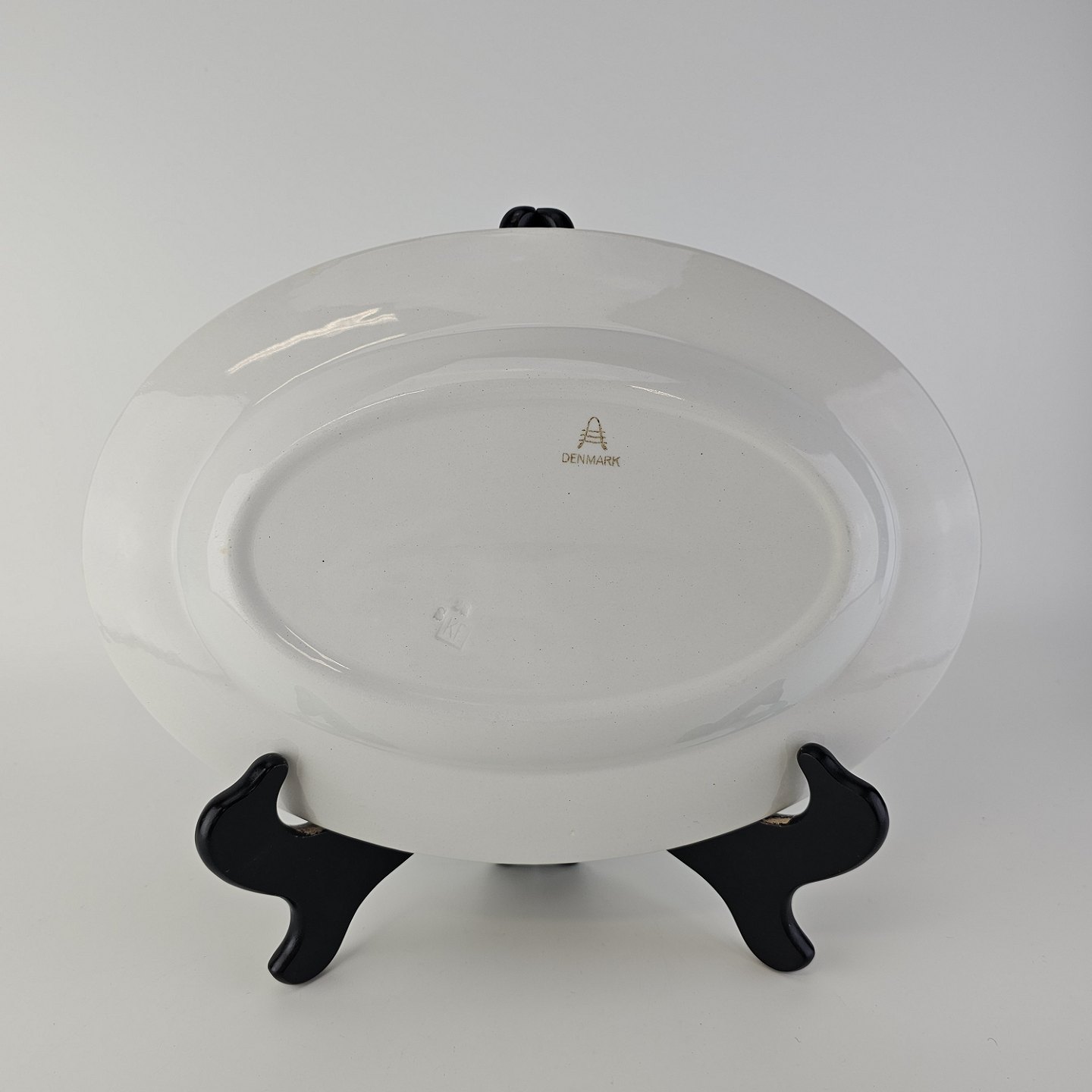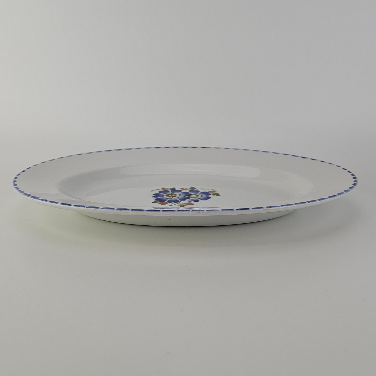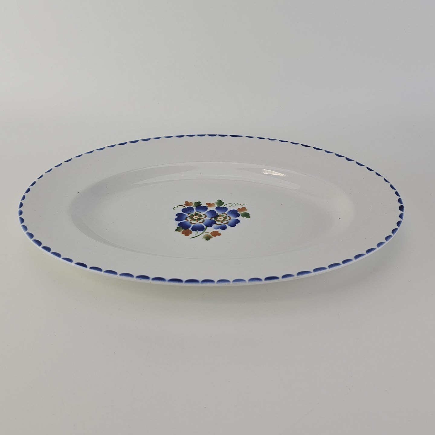 Ovalt fad i fajance fra stellet Geranium II fremstillet i perioden 1927-1940.