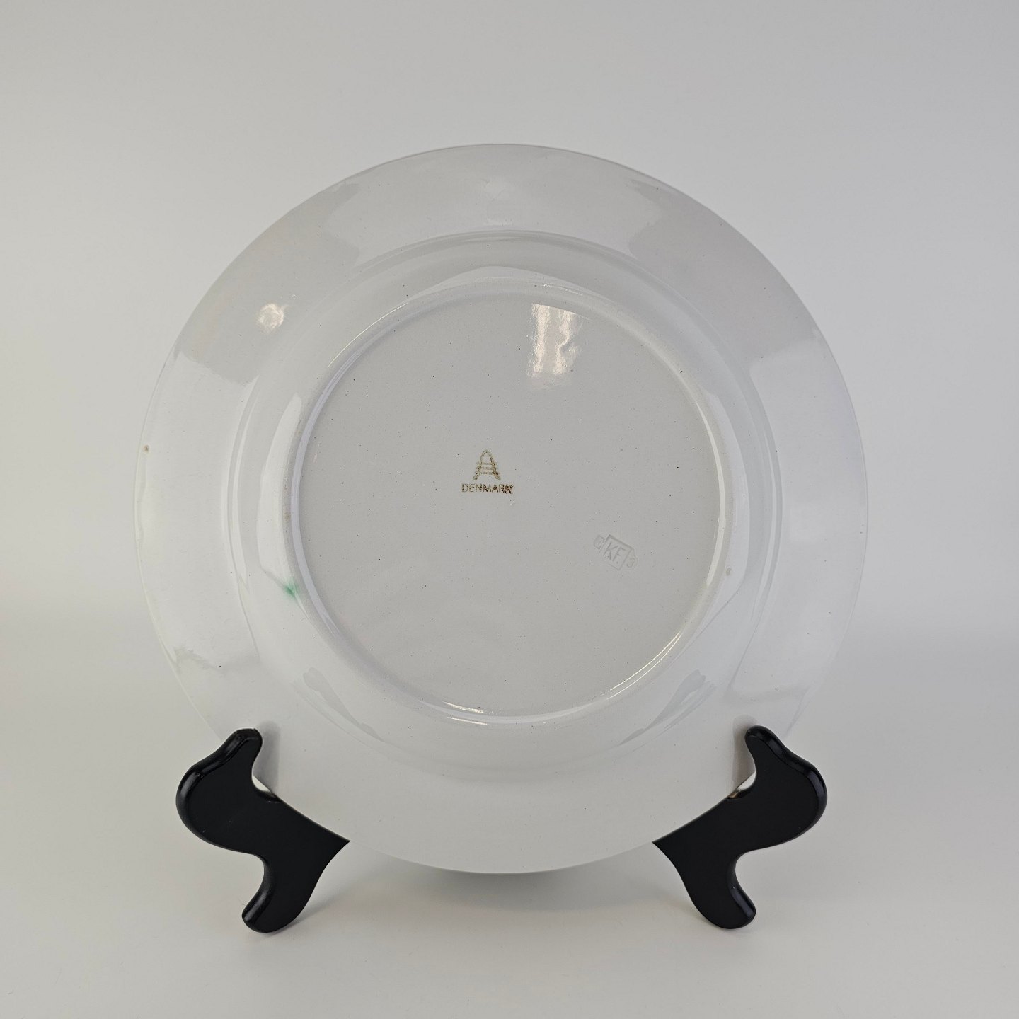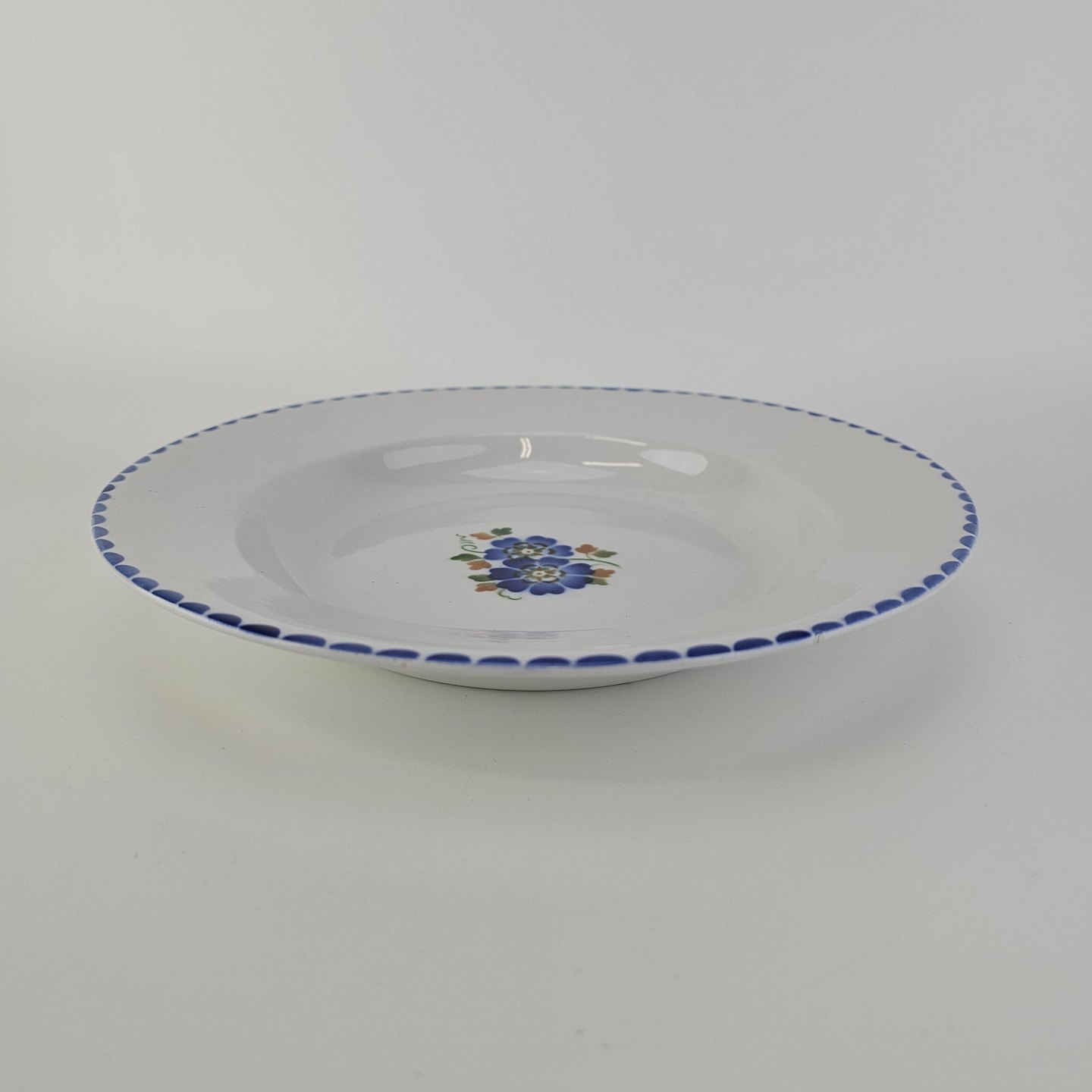 Dyb tallerken i fajance fra stellet Geranium II fremstillet i perioden 1927-1940.
