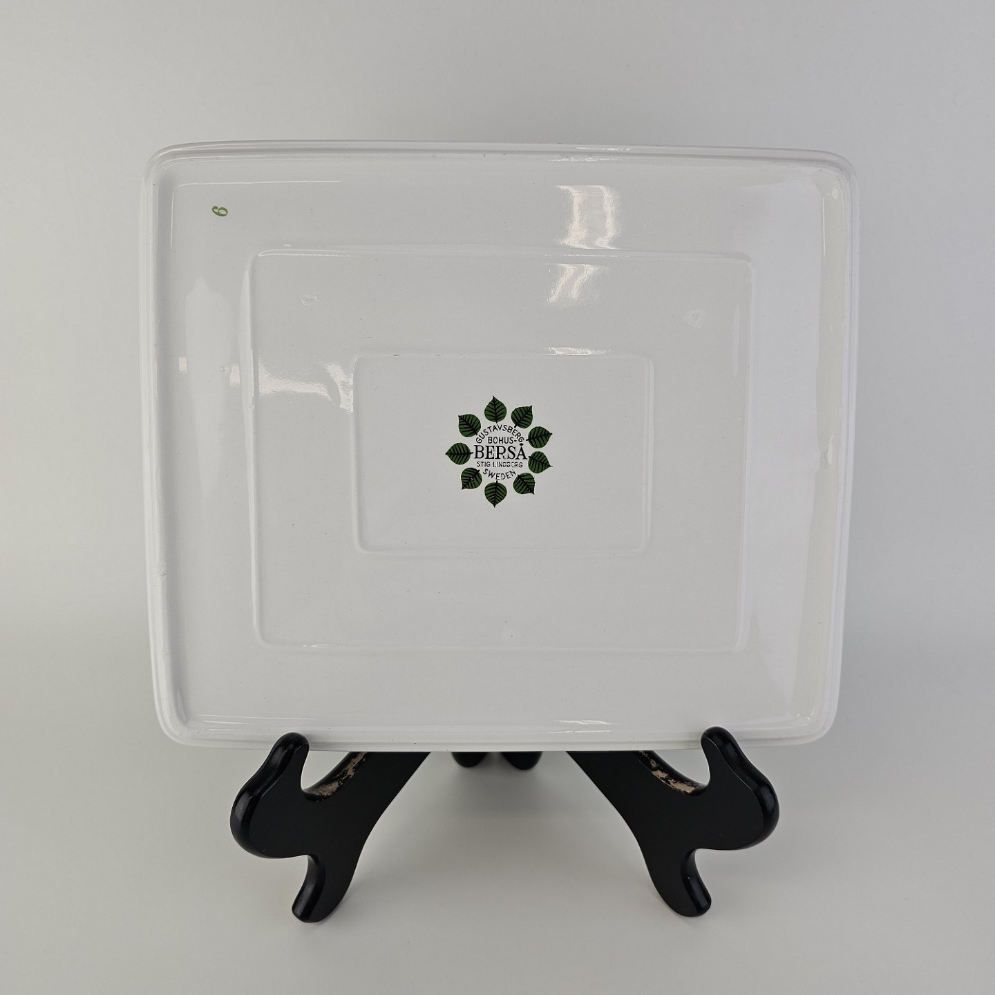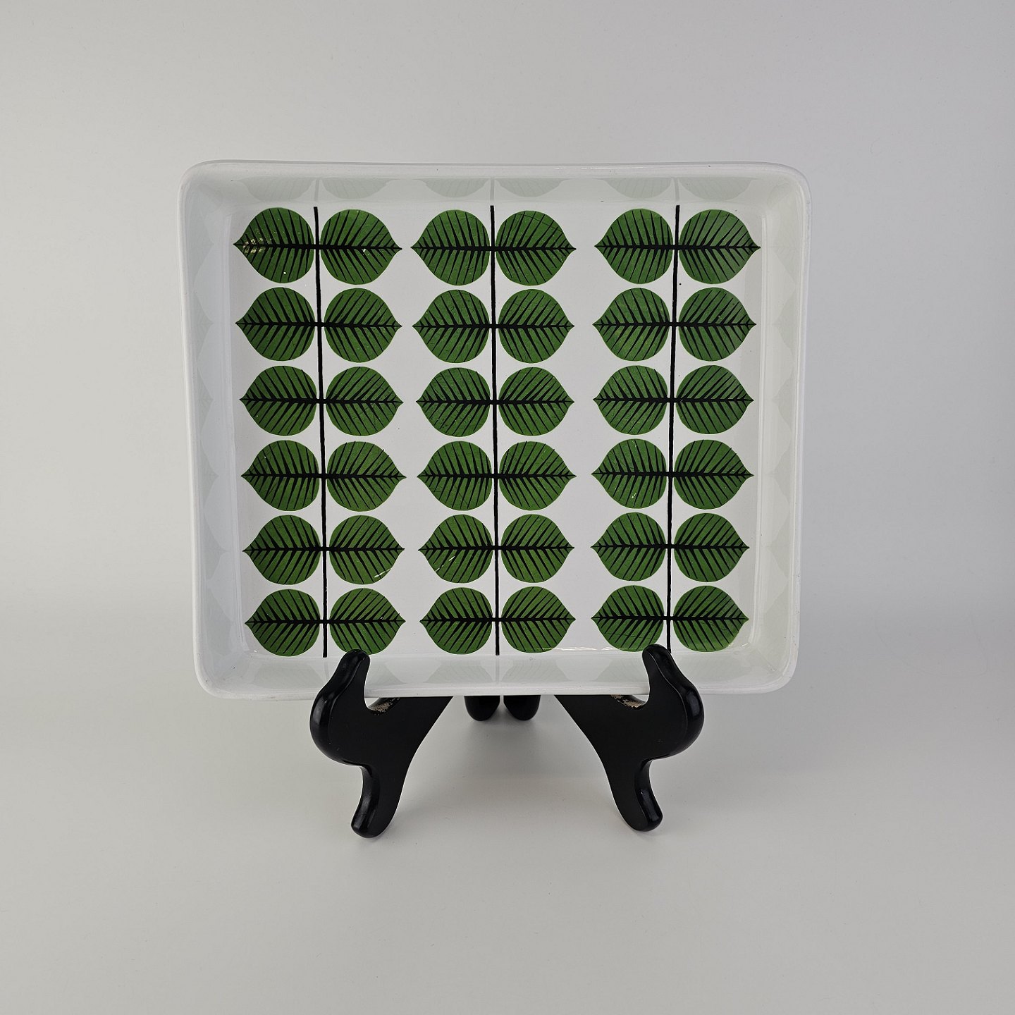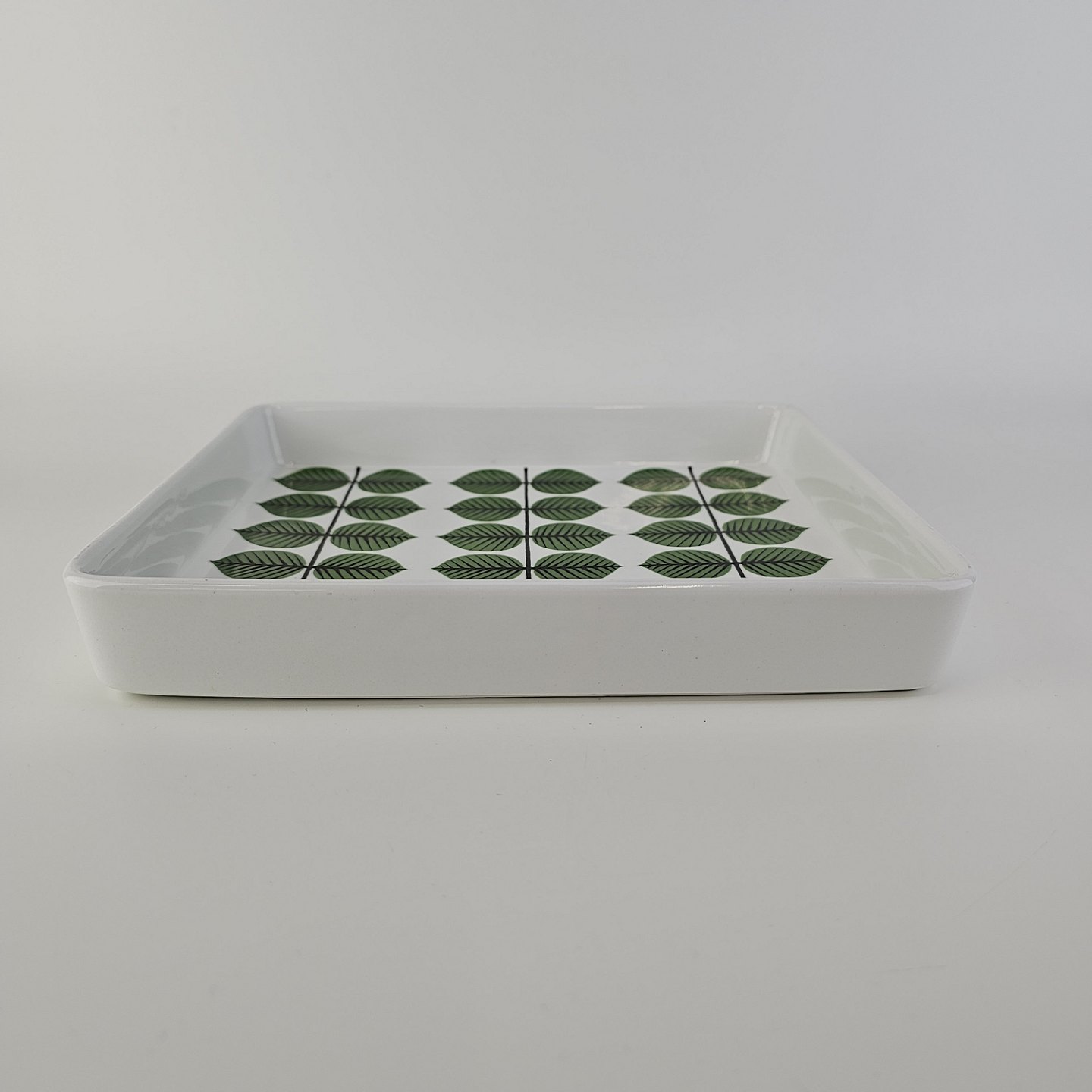 Stel i hvidt porcelæn med dekoration af grønne blade.
