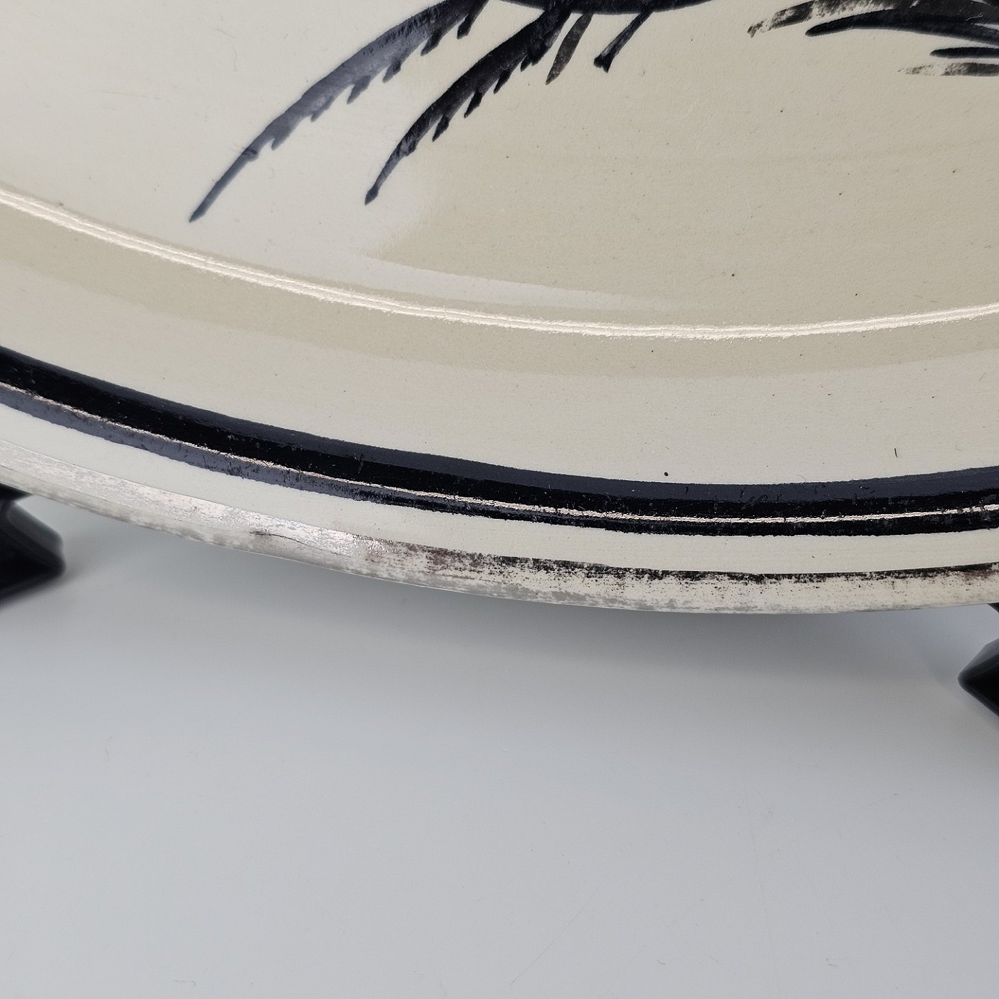Råhvidt fajancestel i stelform E med dekoration af naturmotiver i sølv og sort farve.