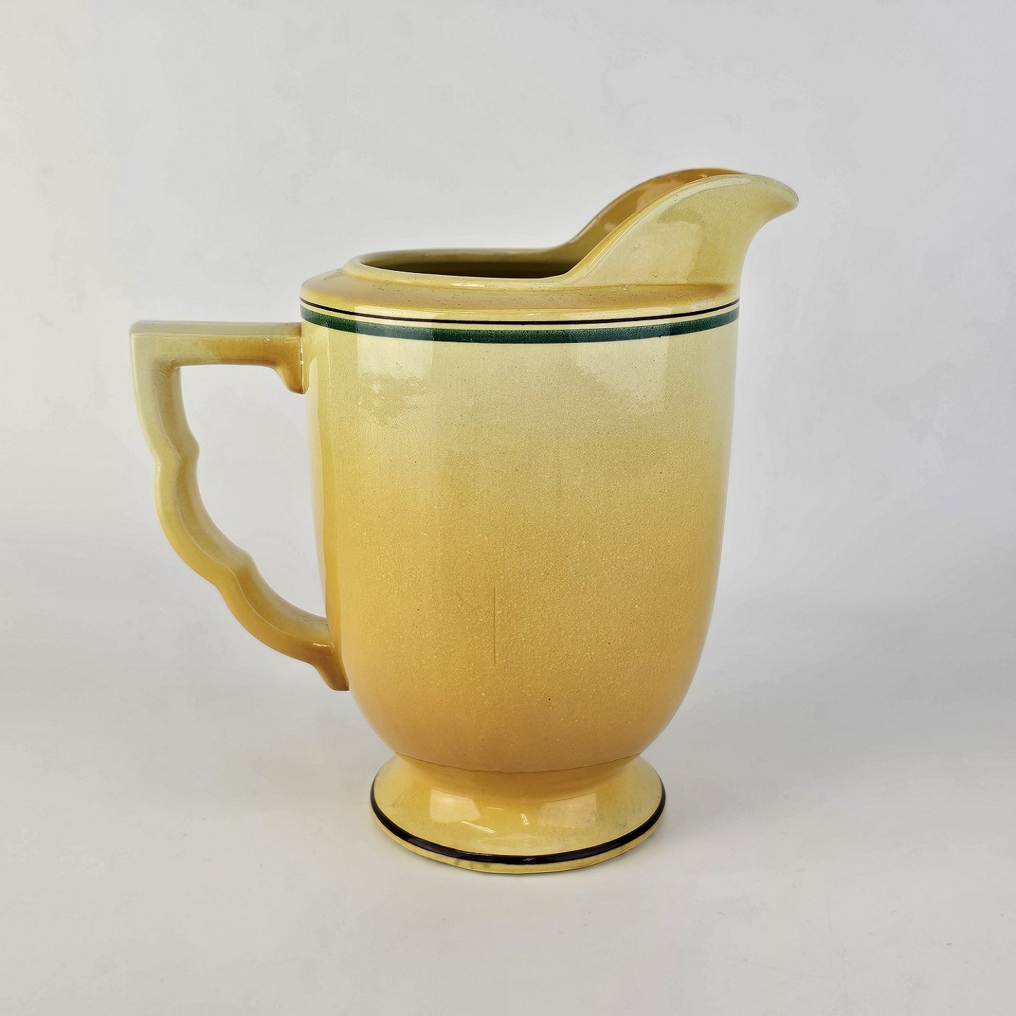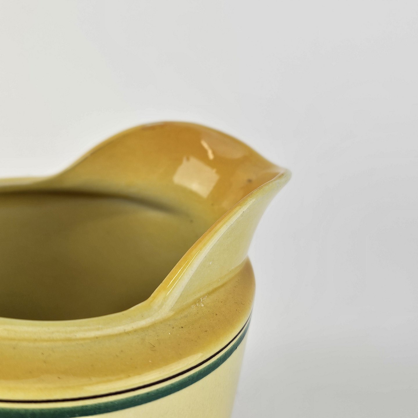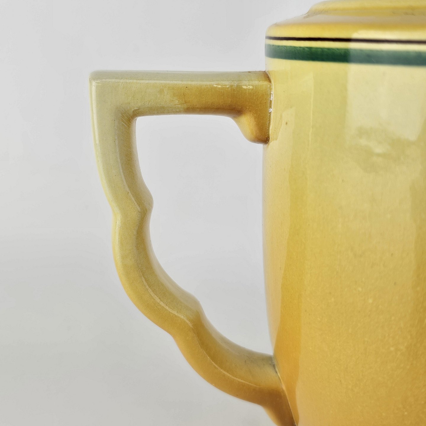 Fajancestel i stelform C med dekoration i gule nuancer med grøn stribe.