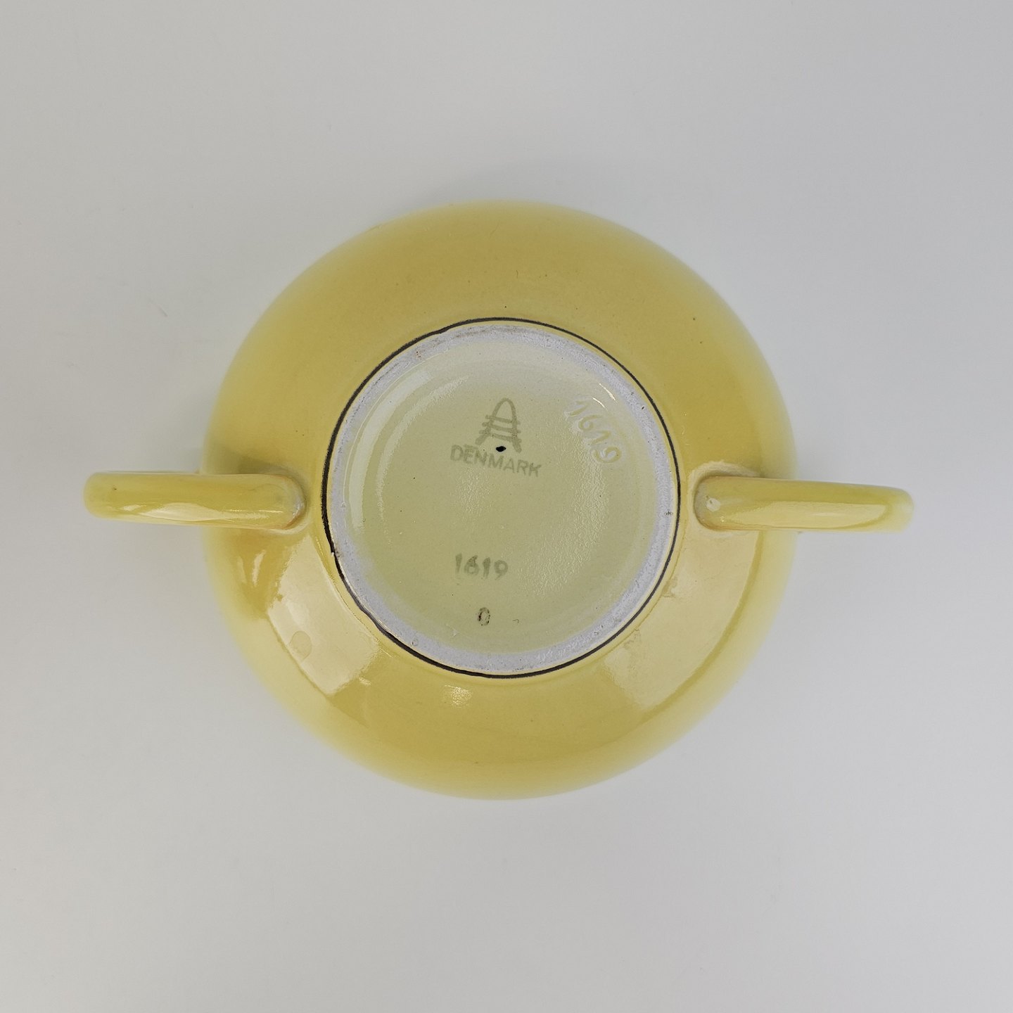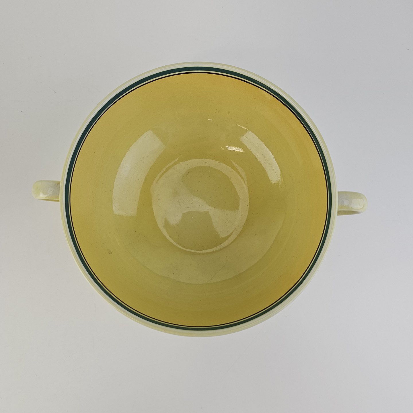 Fajancestel i stelform C med dekoration i gule nuancer med grøn stribe.