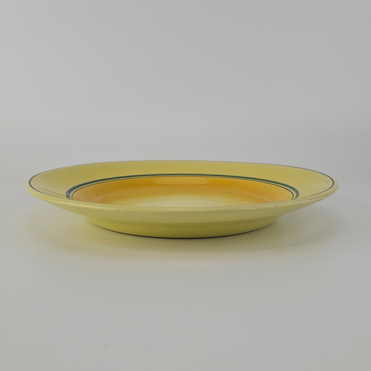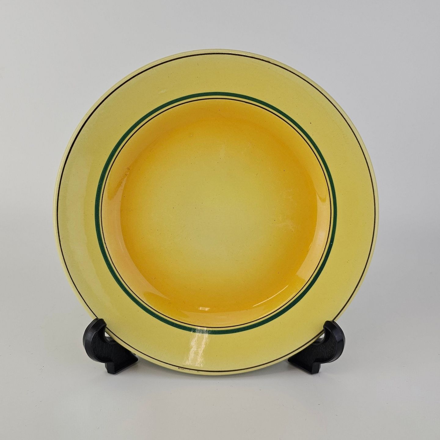 Fajancestel i stelform C med dekoration i gule nuancer med grøn stribe.