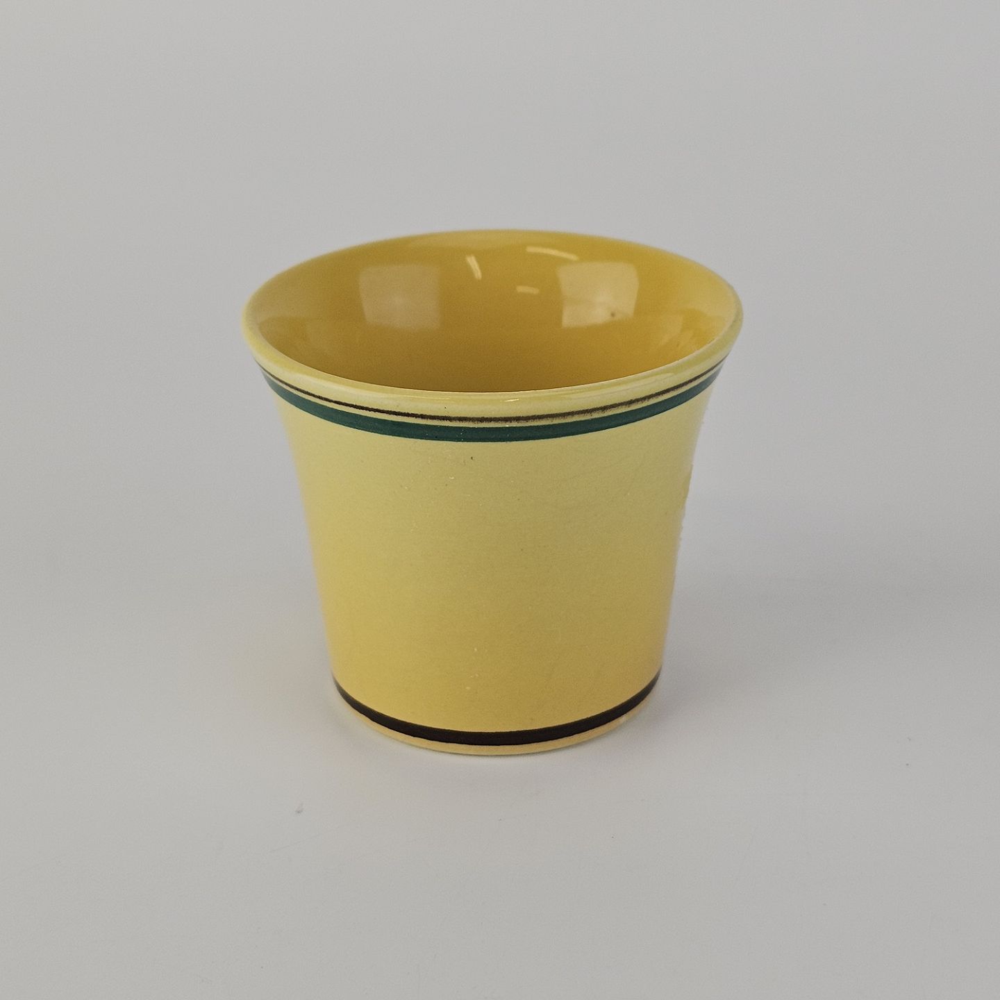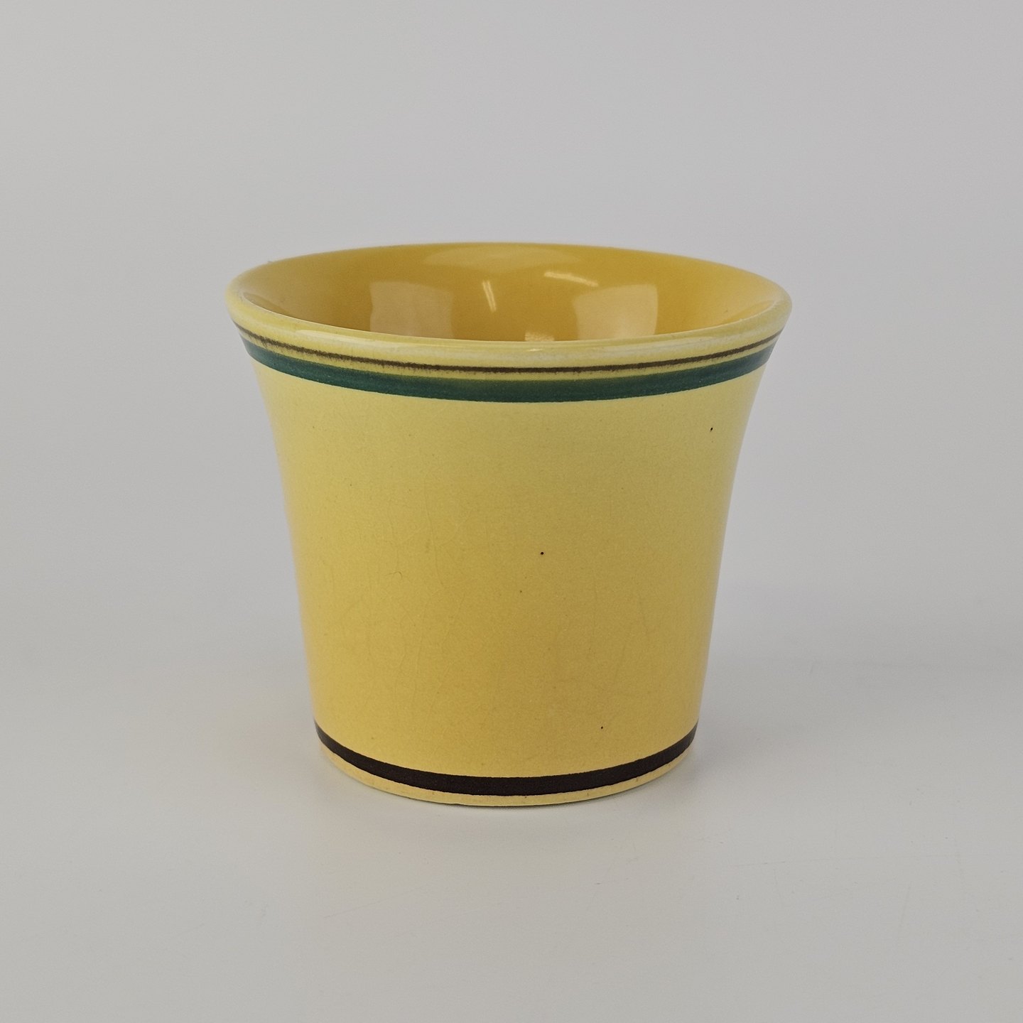 Fajancestel i stelform C med dekoration i gule nuancer med grøn stribe.