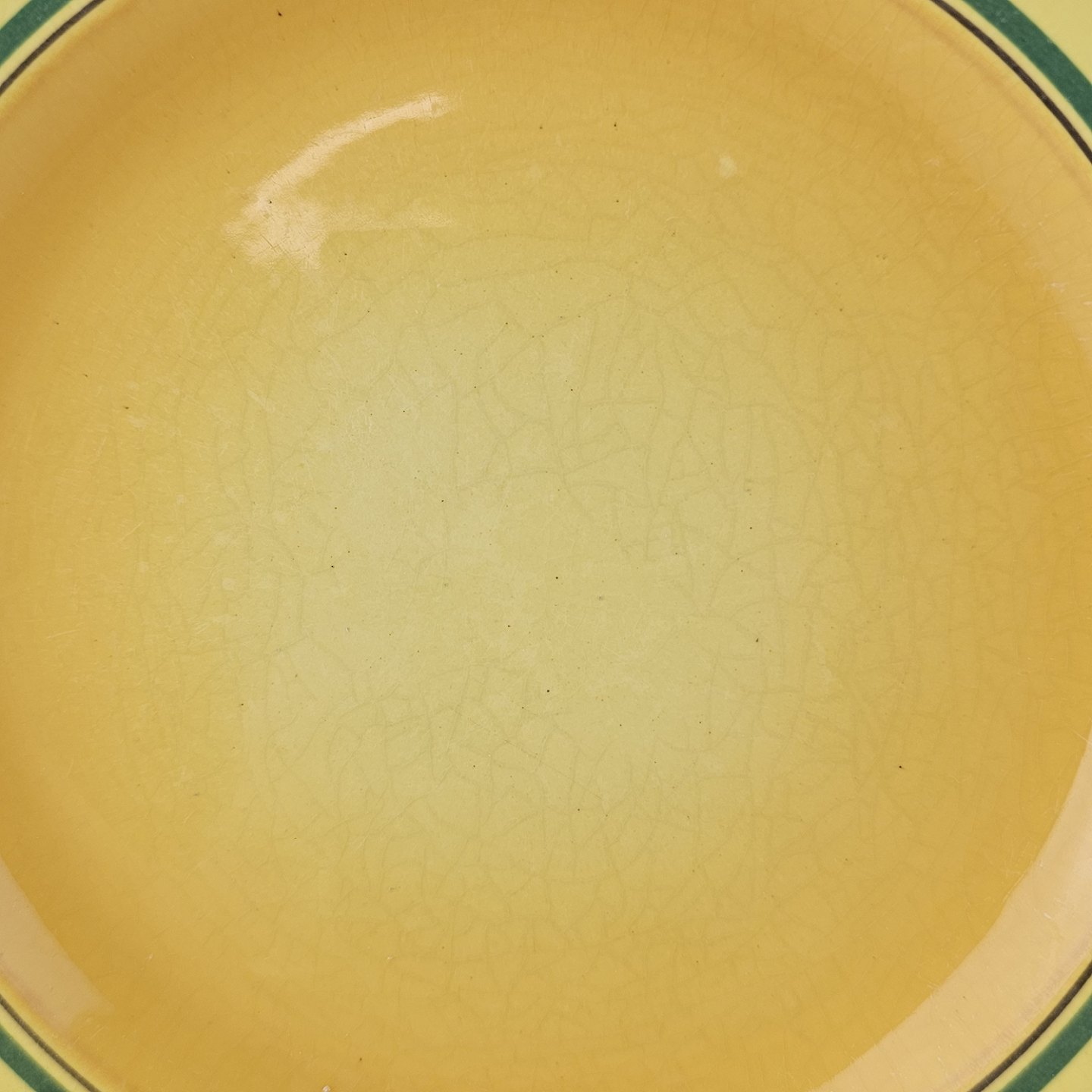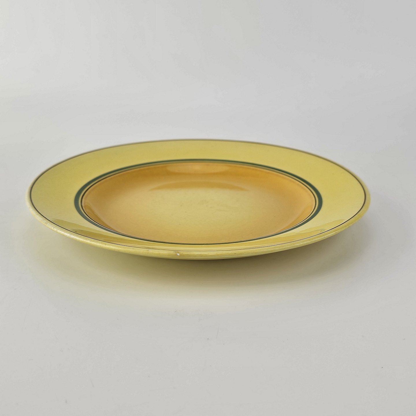 Fajancestel i stelform C med dekoration i gule nuancer med grøn stribe.