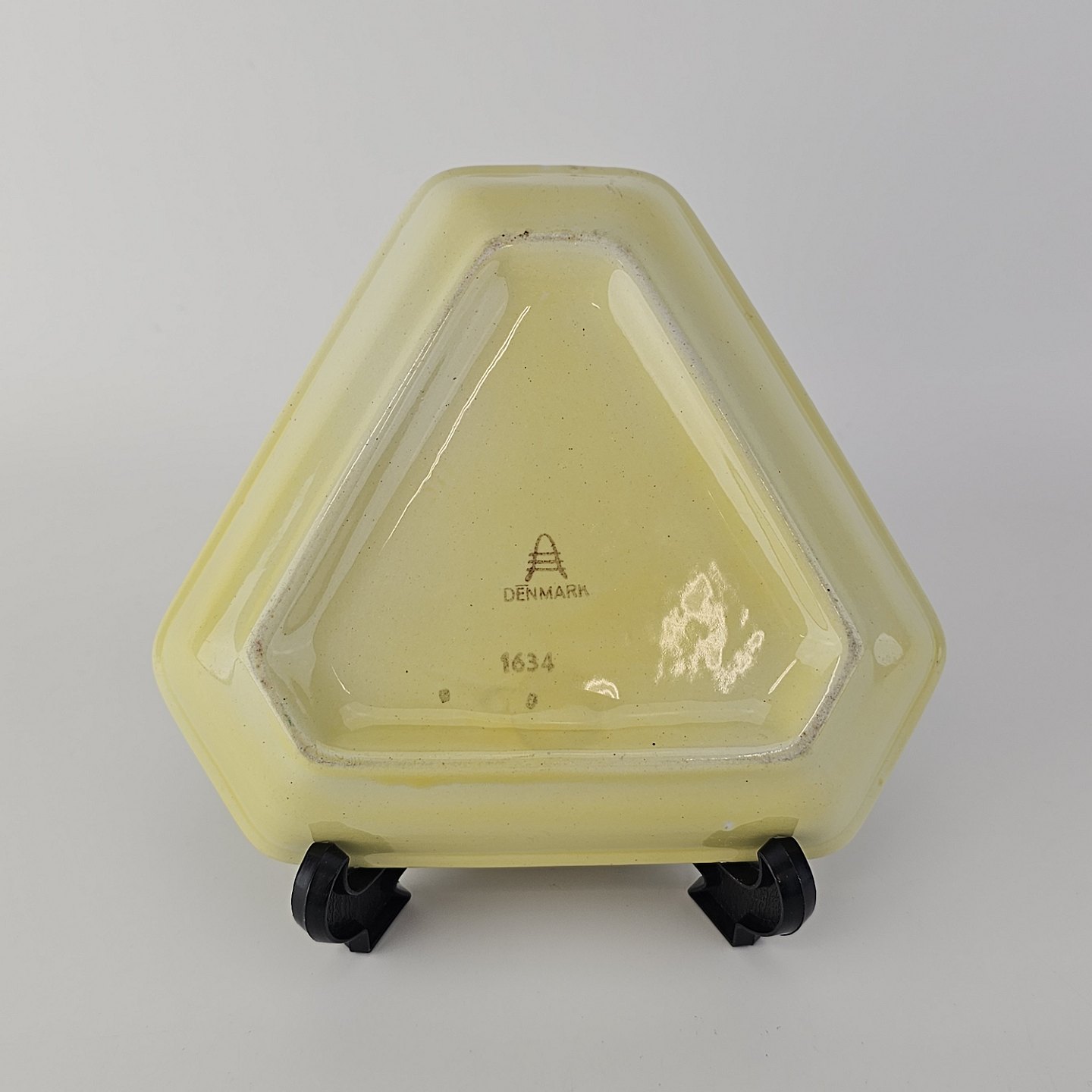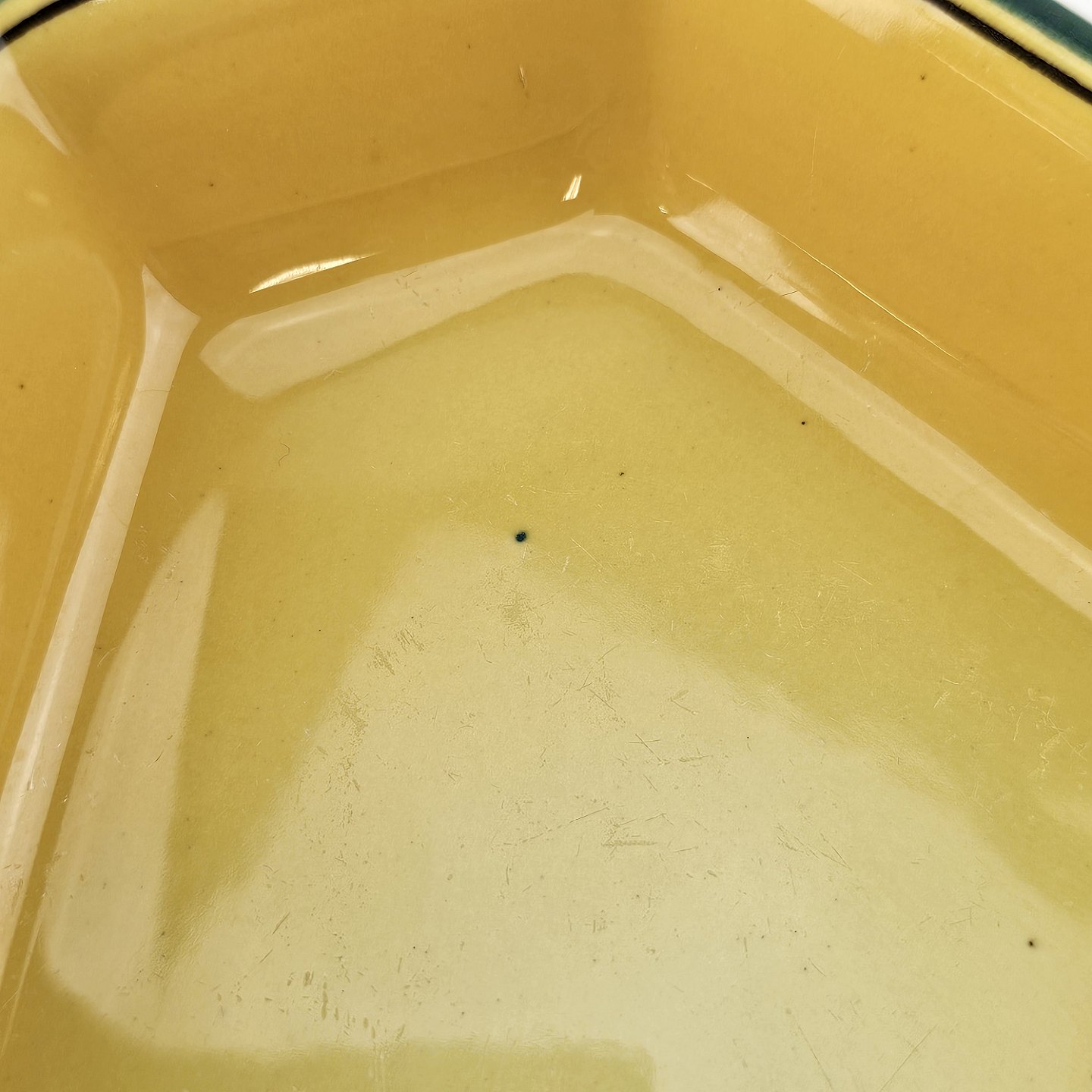 Fajancestel i stelform C med dekoration i gule nuancer med grøn stribe.