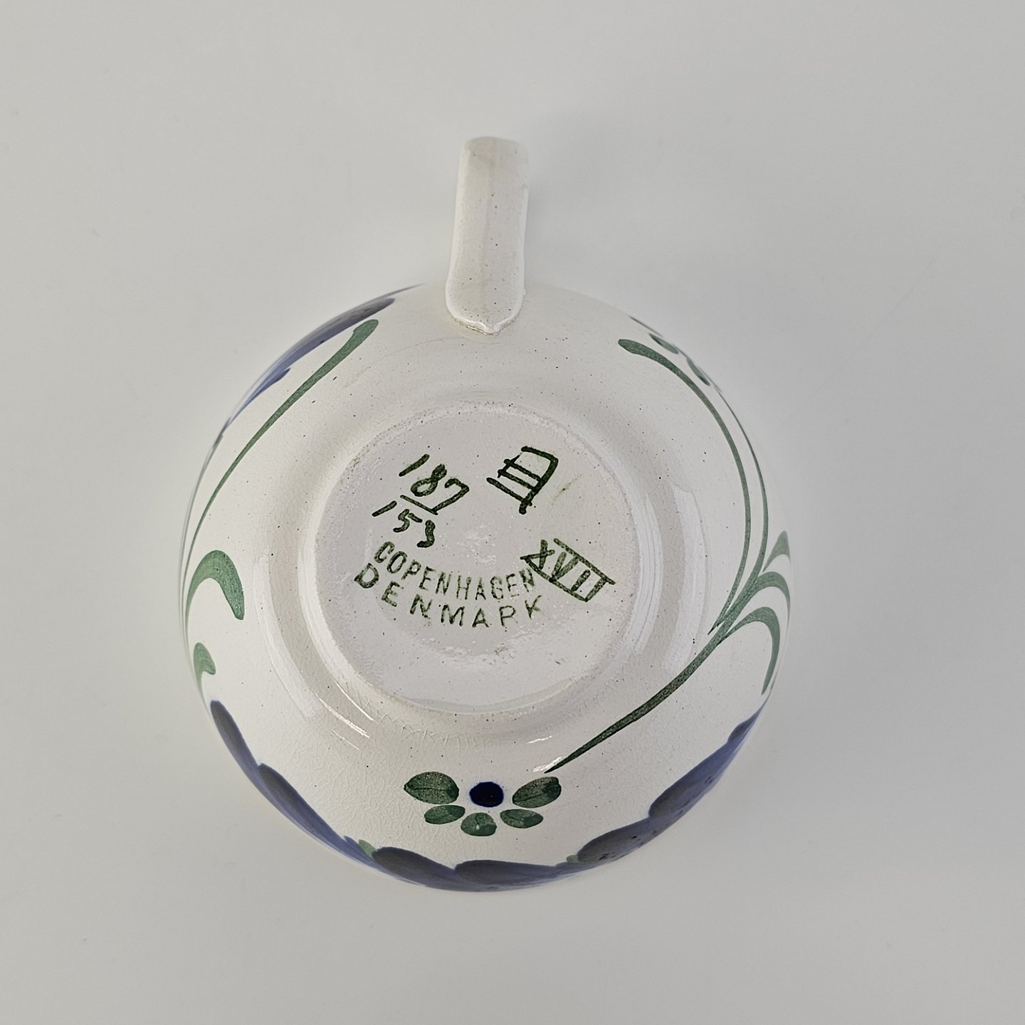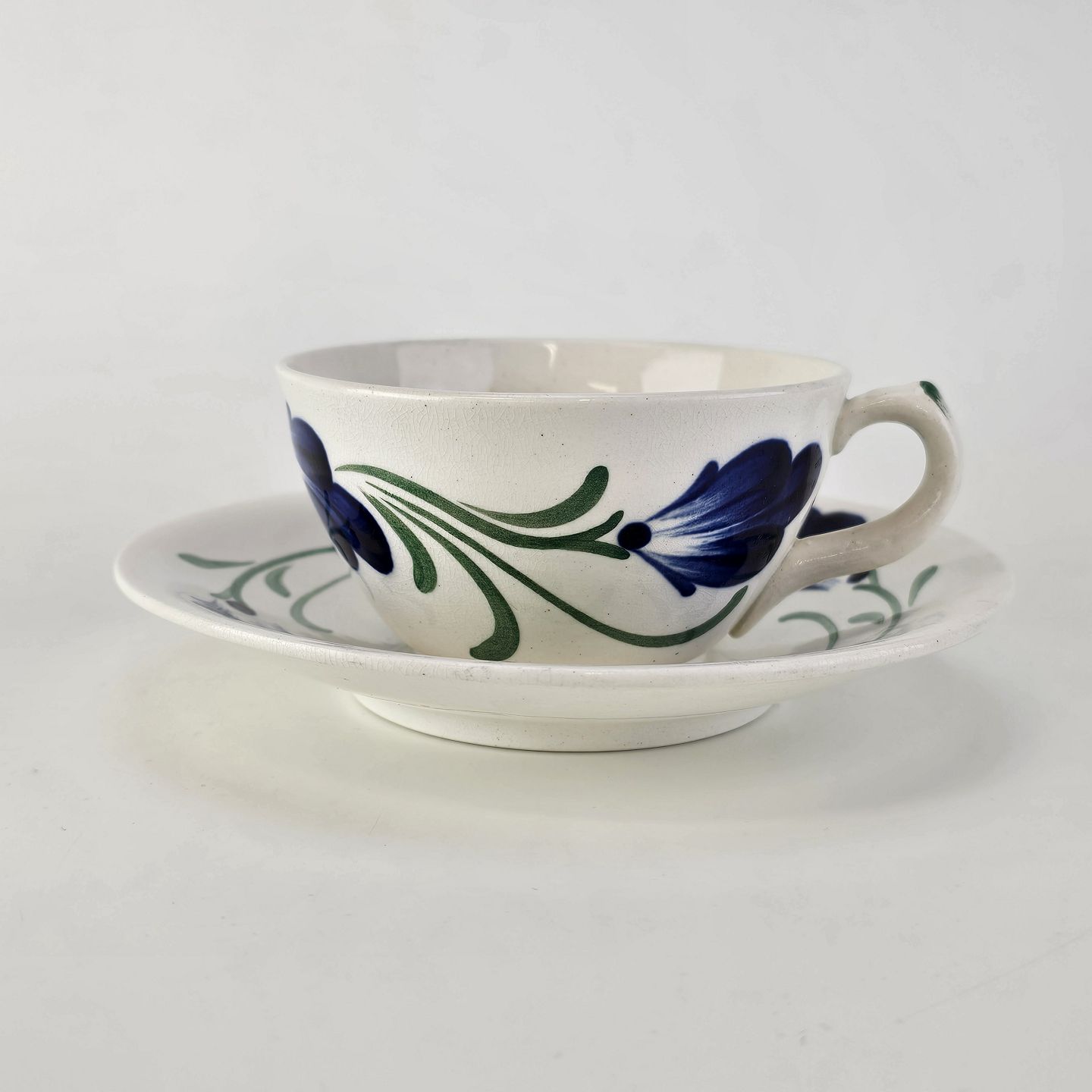 Kop med underkop i hvid fajance fra stellet Blå Cenerarier