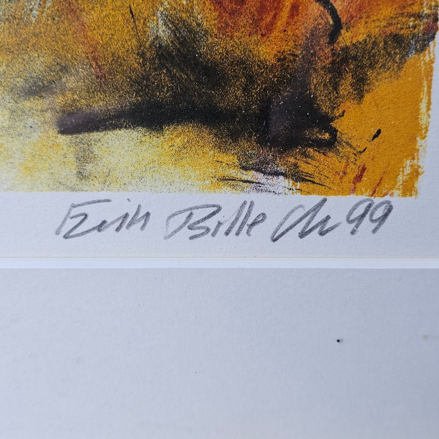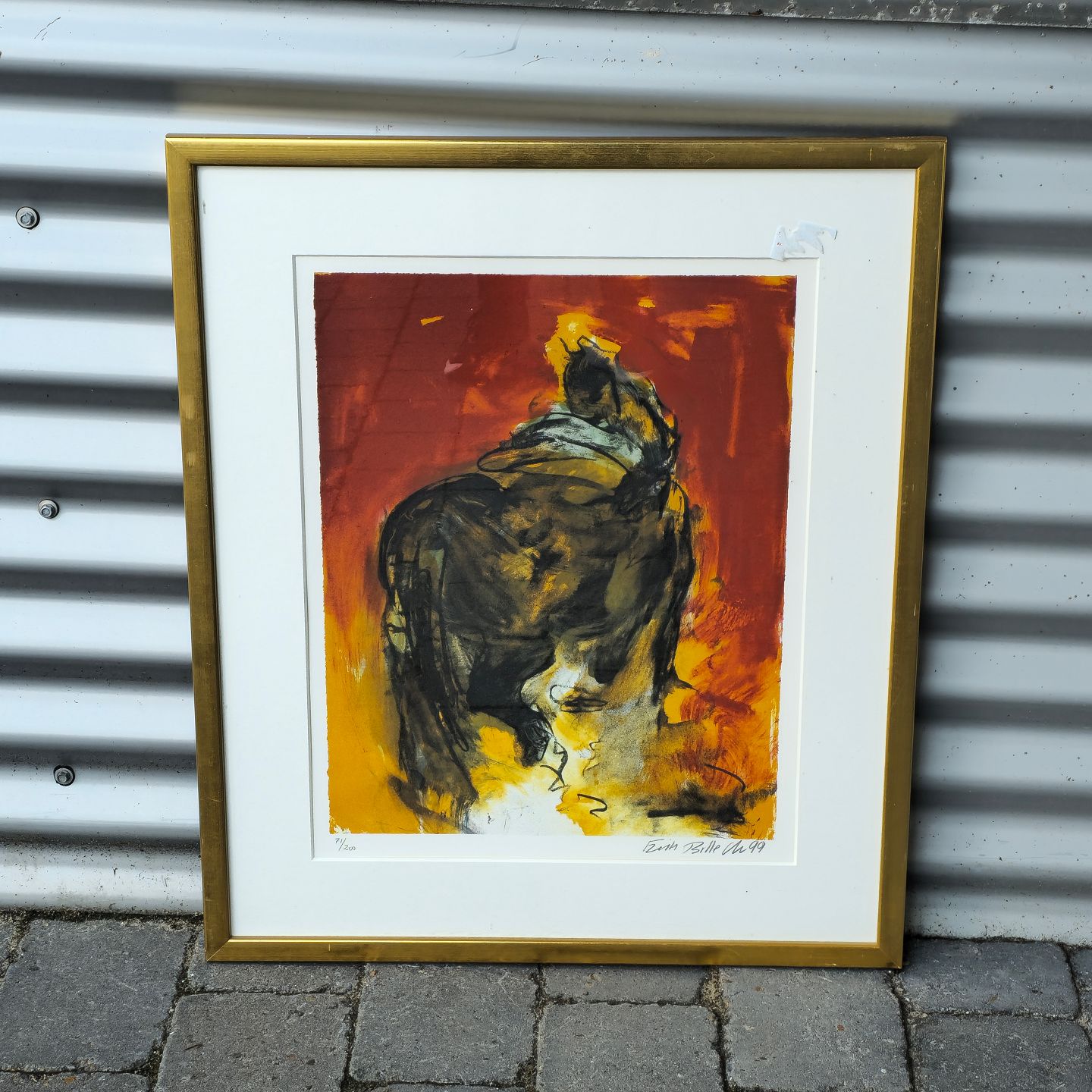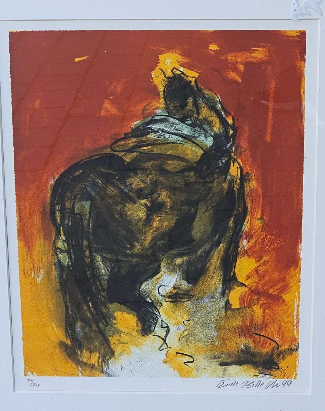 Litografi i sorte, røde og gule nuancer i metal ramme. 71/200
