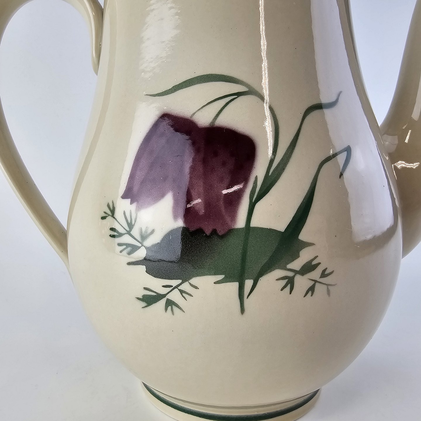 Fajancestel i stelform Viktoria II (Fletværk) med flettet kant og dekoration af en vibeæg blomst i violet og grøn, fremstillet i perioden 1934-1967