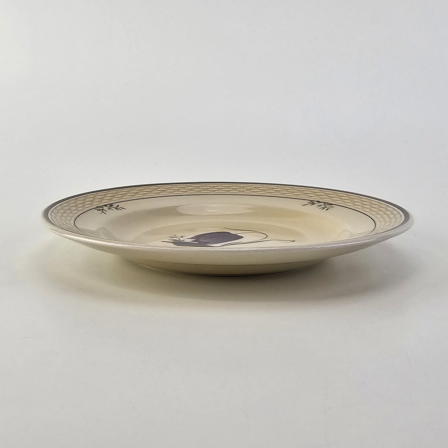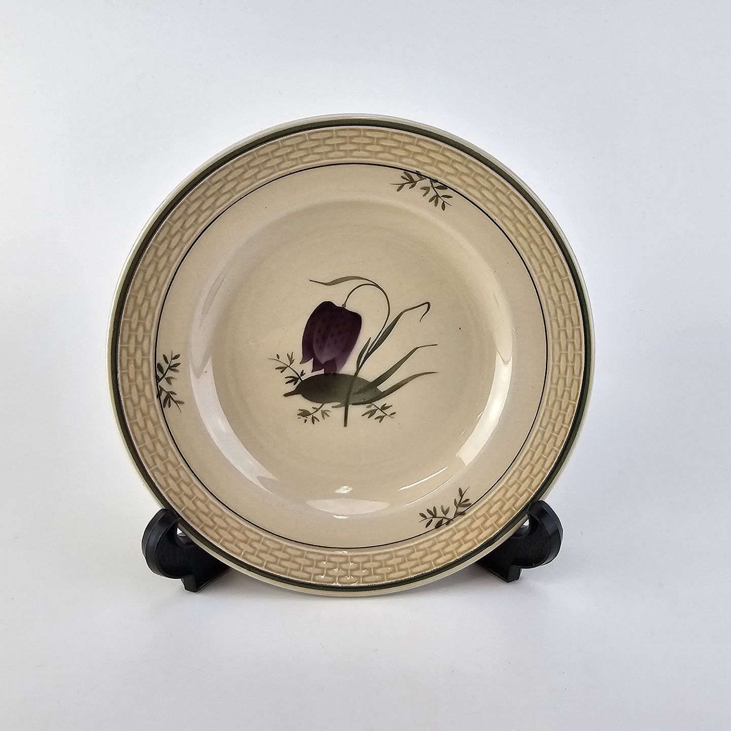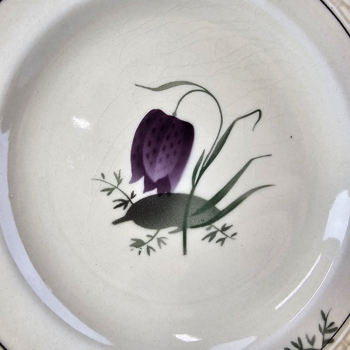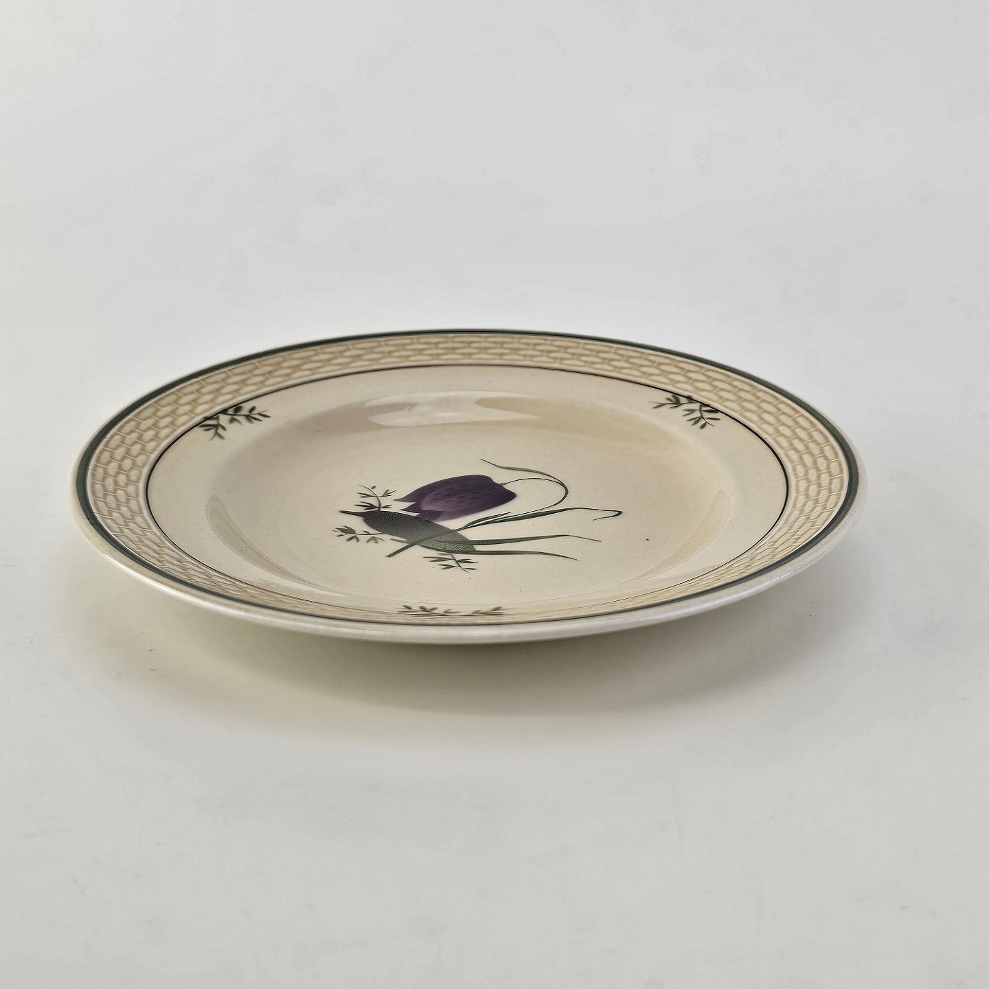 Fajancestel i stelform Viktoria II (Fletværk) med flettet kant og dekoration af en vibeæg blomst i violet og grøn, fremstillet i perioden 1934-1967