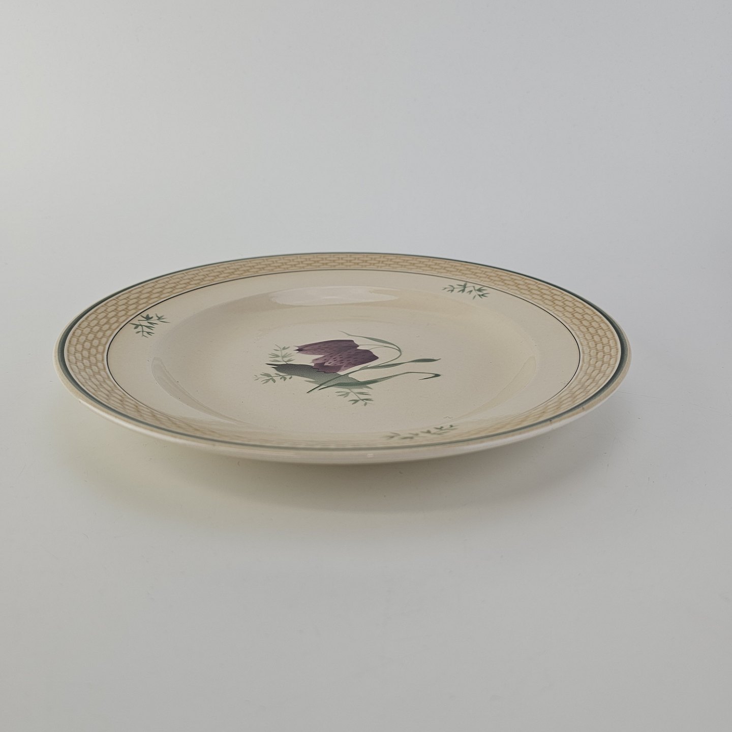 Fajancestel i stelform Viktoria II (Fletværk) med flettet kant og dekoration af en vibeæg blomst i violet og grøn, fremstillet i perioden 1934-1967