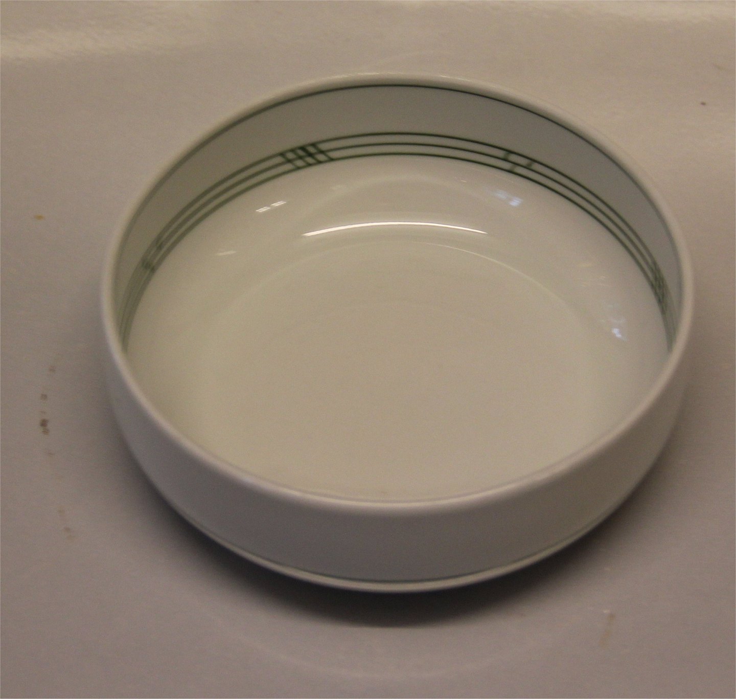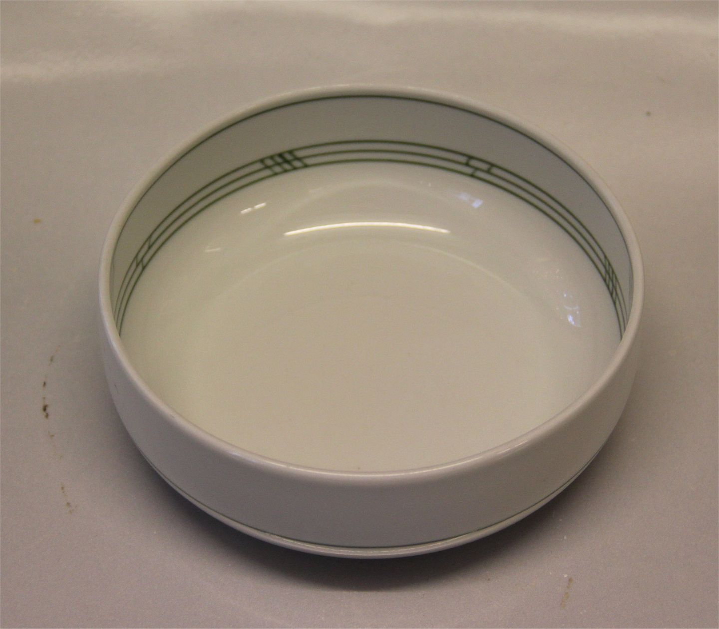 323 Dyb tallerken / Ymerskål 5 x 14,6 cm (023) Olympia Bing & Grøndahl B&G Olympia: Kraftigt hvidt porcelæn med mønster med grønne streger, som Delfi, form 43 I fin og hel stand Bing & Groendahl