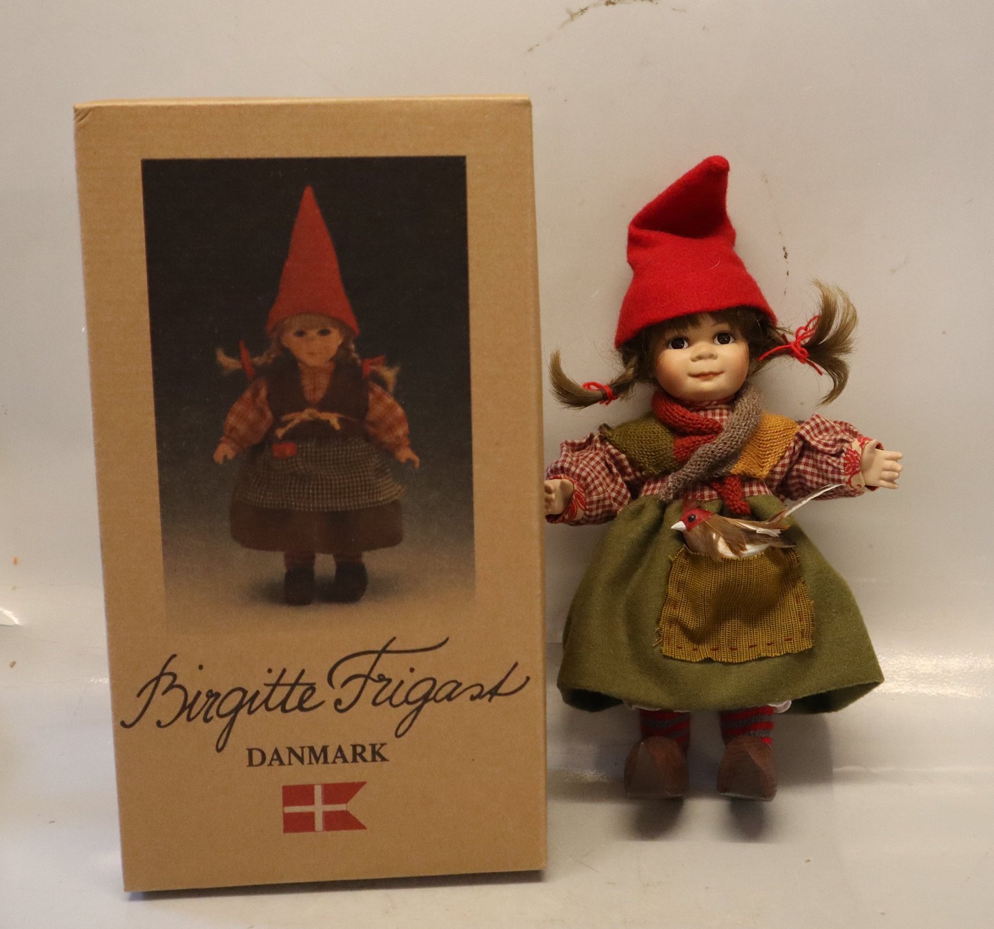 Beskrivelse: Nissepige med fugl 27 cm Birgitte Frigast i original boks Begrænset oplag No 64 af 450