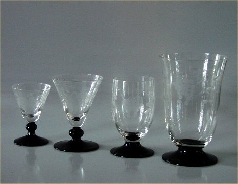 Beskrivelse: Taasine drikkeglas Holmegaard på sort fod med slibninger graveret med drueranke slibning.
