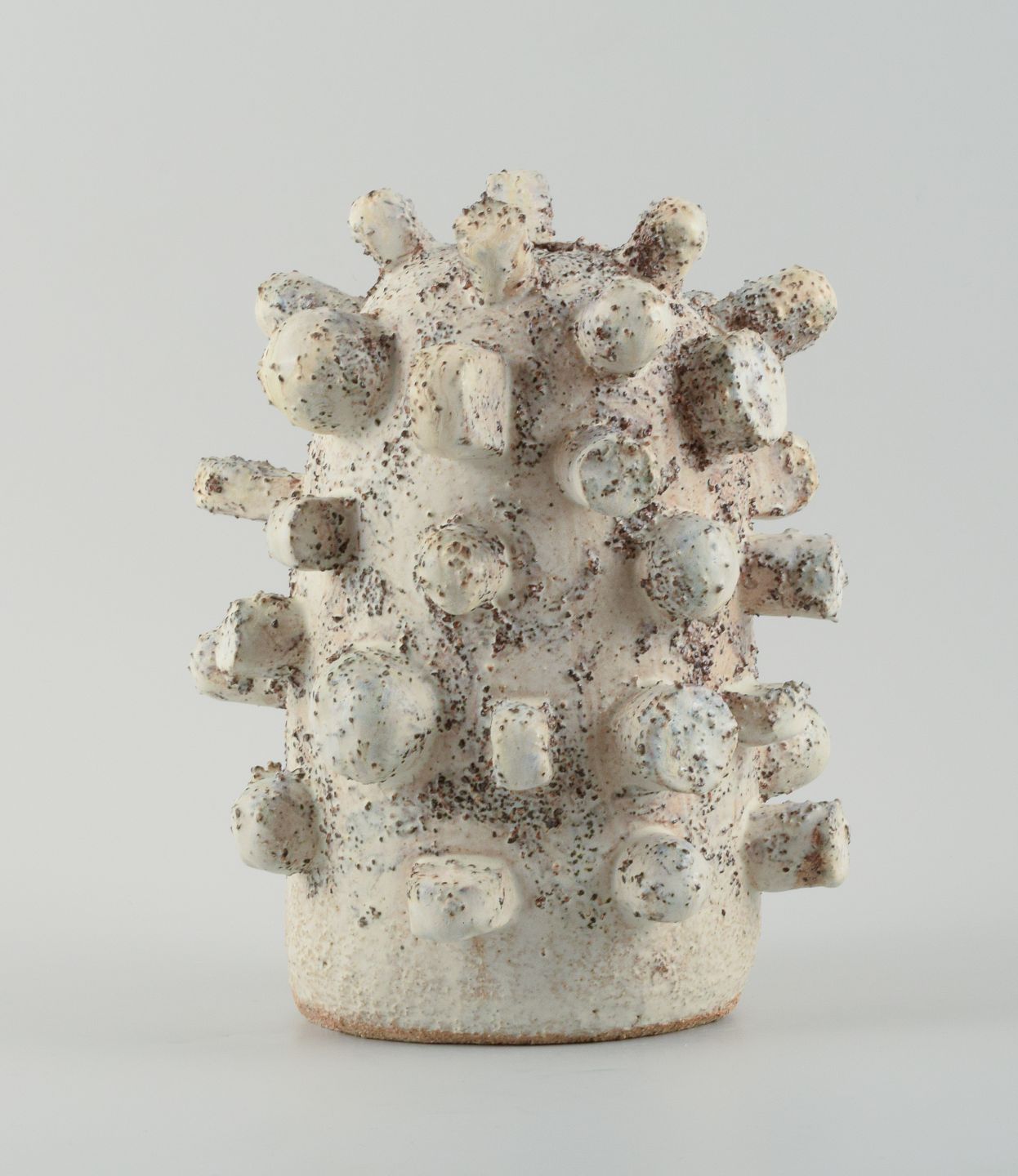 Large unique stoneware sculpture in offwhite glaze with ironcovered specks.