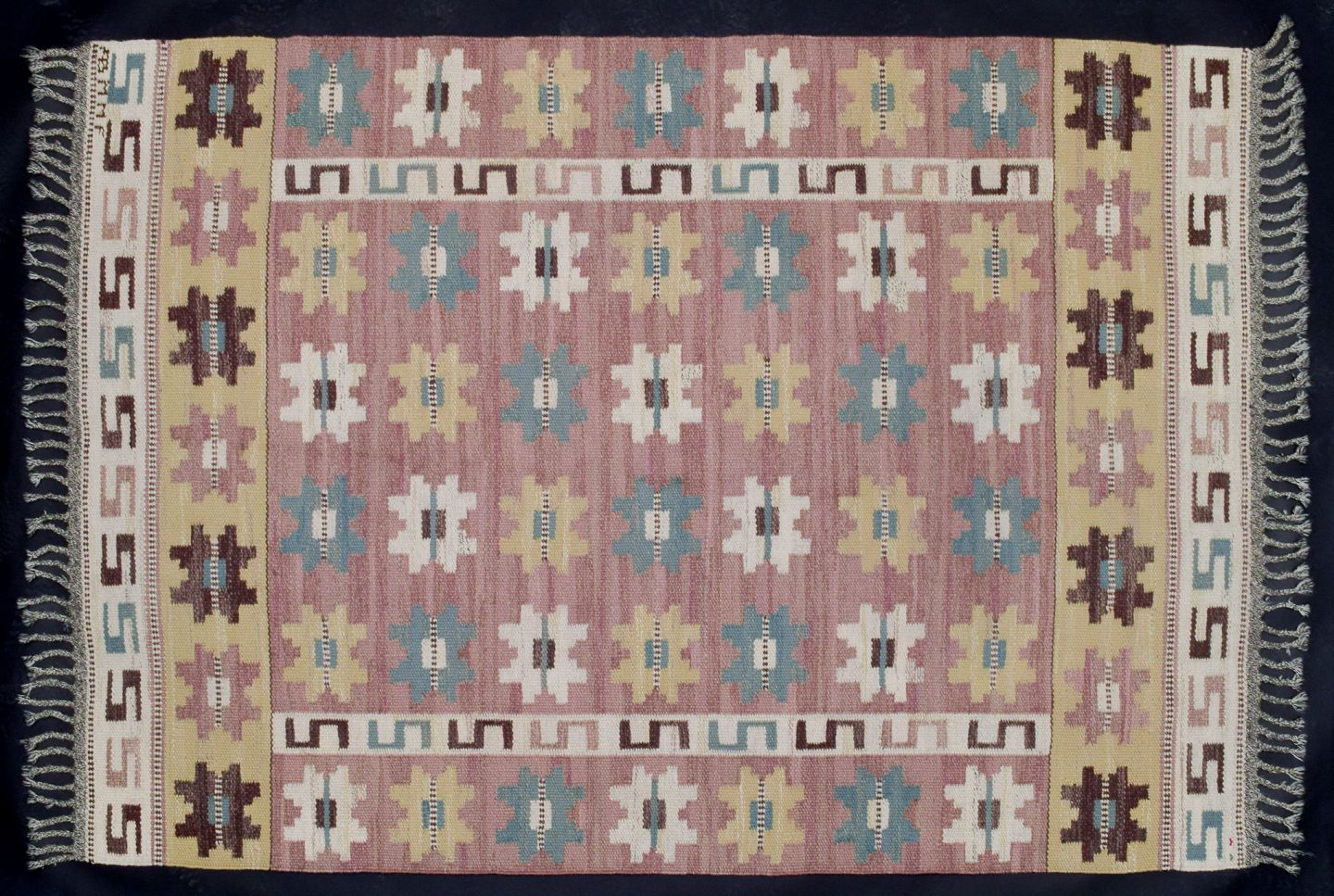 “Sipporna” (The Anemones). Handwoven unique wool carpet in "rölakan" technique with polychrome geometric pattern.