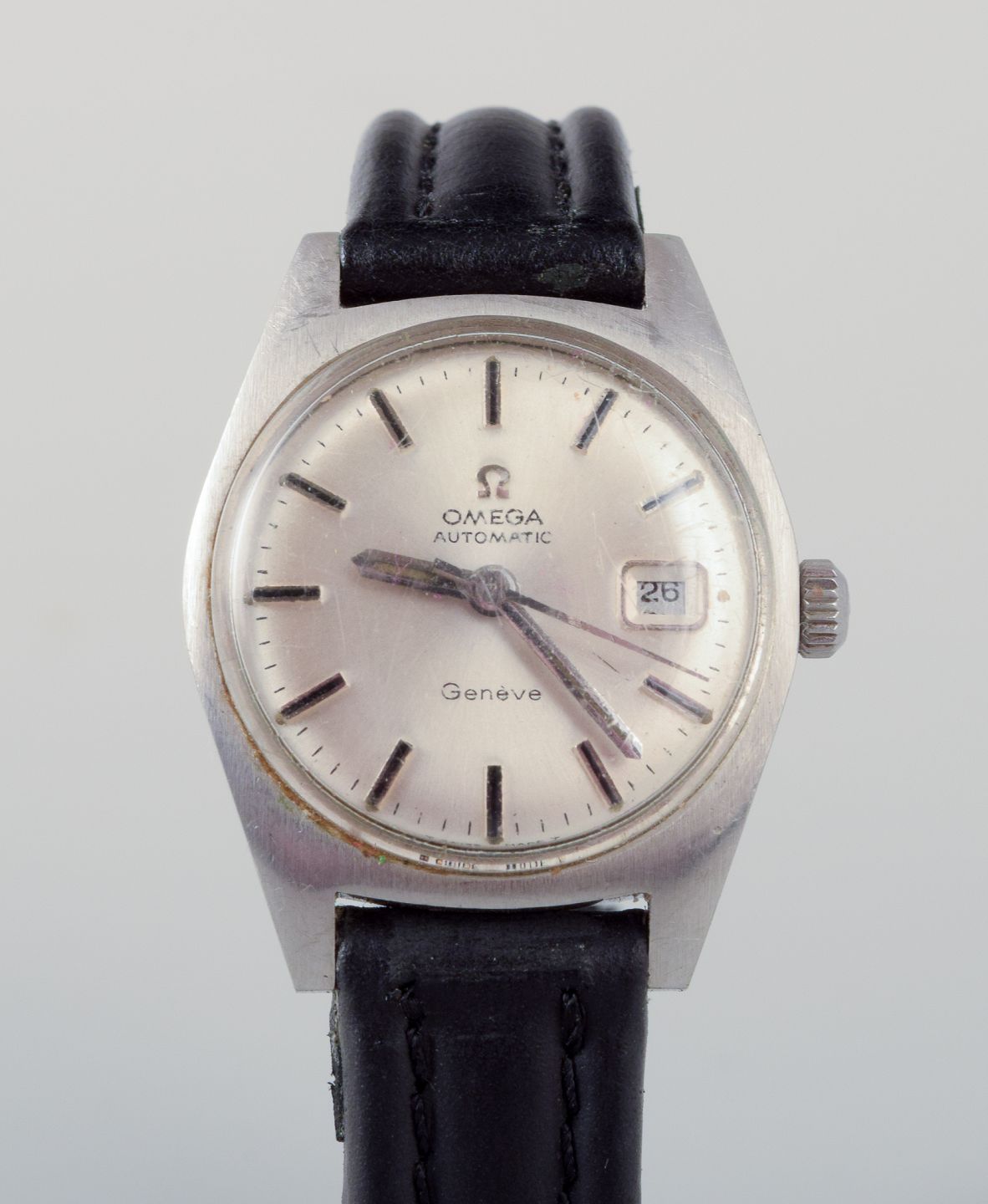 Omega Geneve ladies' wristwatch with a black leather strap.