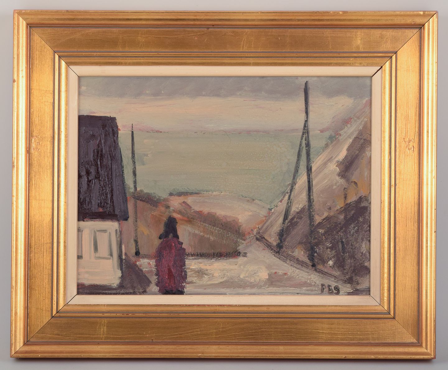Peder Brøndum Sørensen (1931-2003), Danish painter, oil on canvas. "Grey Day by the Sea." Modernist cityscape with figure.