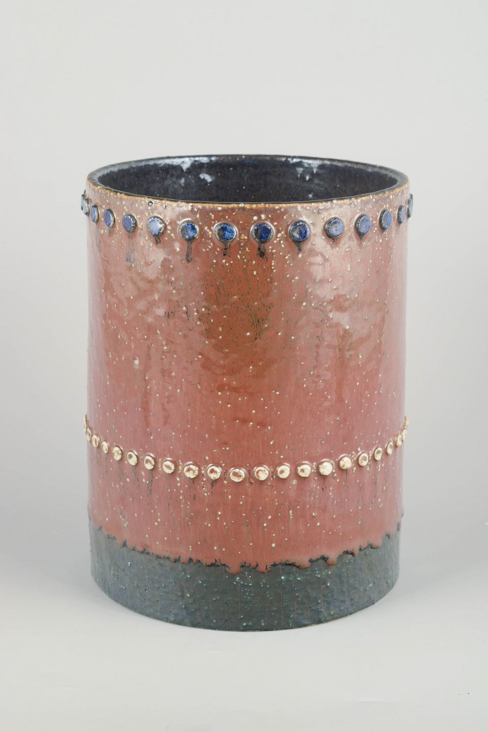 Cylindrical hand-thrown stoneware vase with warm reddish-brown glaze, dark interior glaze and decorative bands of applied blue and light ceramic studs in relief.