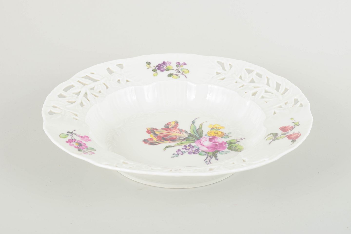 Hand-painted porcelain with floral motif in multicoloured palette and openwork rim in classic style. Elegant deep form with richly decorated centre and refined craftsmanship.